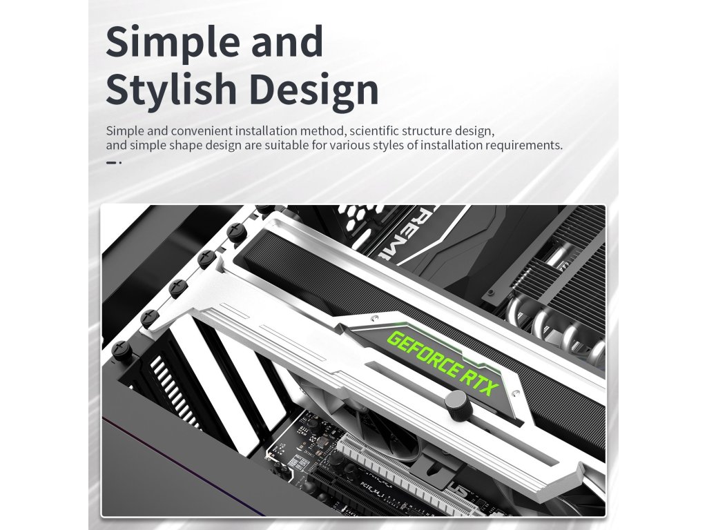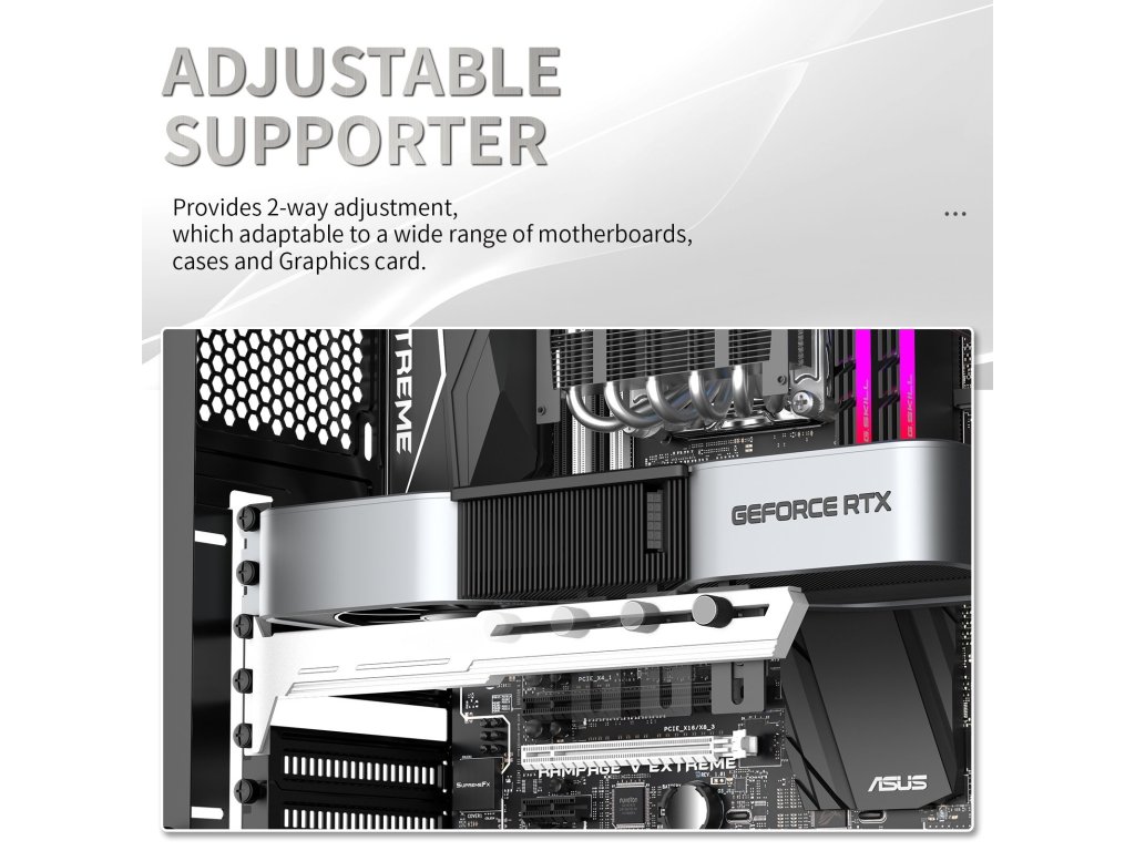 Stylová varianta této opory Vaší grafické karty je vyrobena z ocelového práškově lakovaného plechu a plastu, zabraňuje prohýbání větších karet ve slotu a dodává tak sestavě lepší celkovou stabilitu. Součástí je silikonová posuvná opora, kterou lze posunout jak horizontálně tak i vertikálně a umožňuje instalaci v různých místech karty, pro maximální kompatibilitu s většinou karet. Rozměry držáku jsou 280 x 52mm.