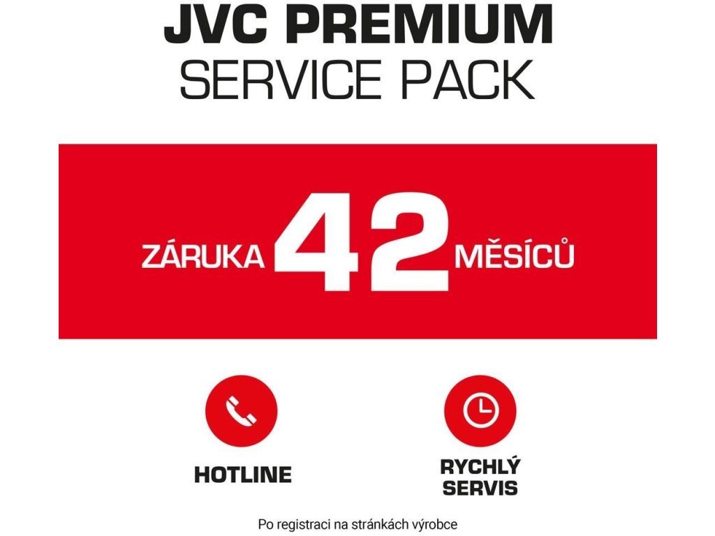 Za kvalitou našich výrobků si stojíme, a proto Vám rádi poskytneme delší záruční lhůtu, která je součástí balíčku prémiových služeb. Součástí je i domácí servis pro úhlopříčky nad 49“, který zahrnuje návštěvu technika u Vás doma v případě záručního zákroku. Pro získání prodloužené 42měsíční záruky je nutná registrace nákupu na www.jvc-tv.cz/guarantee-42/.