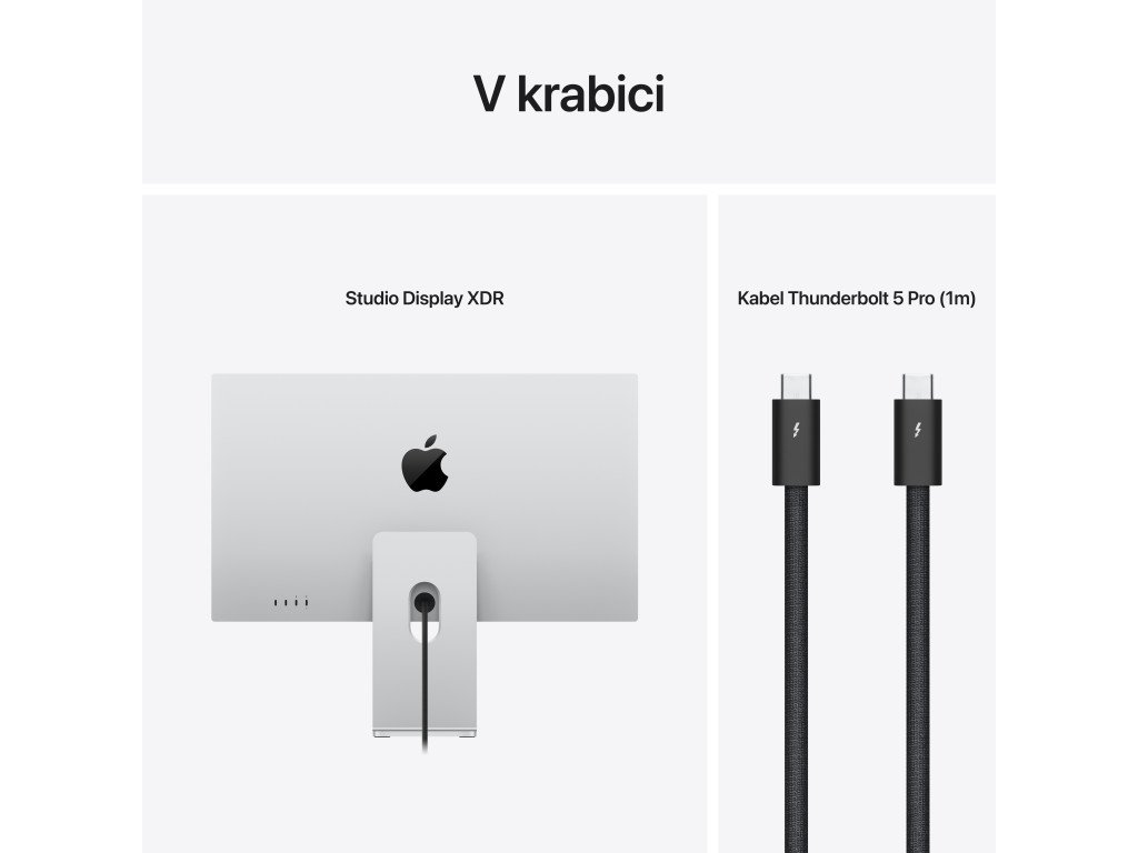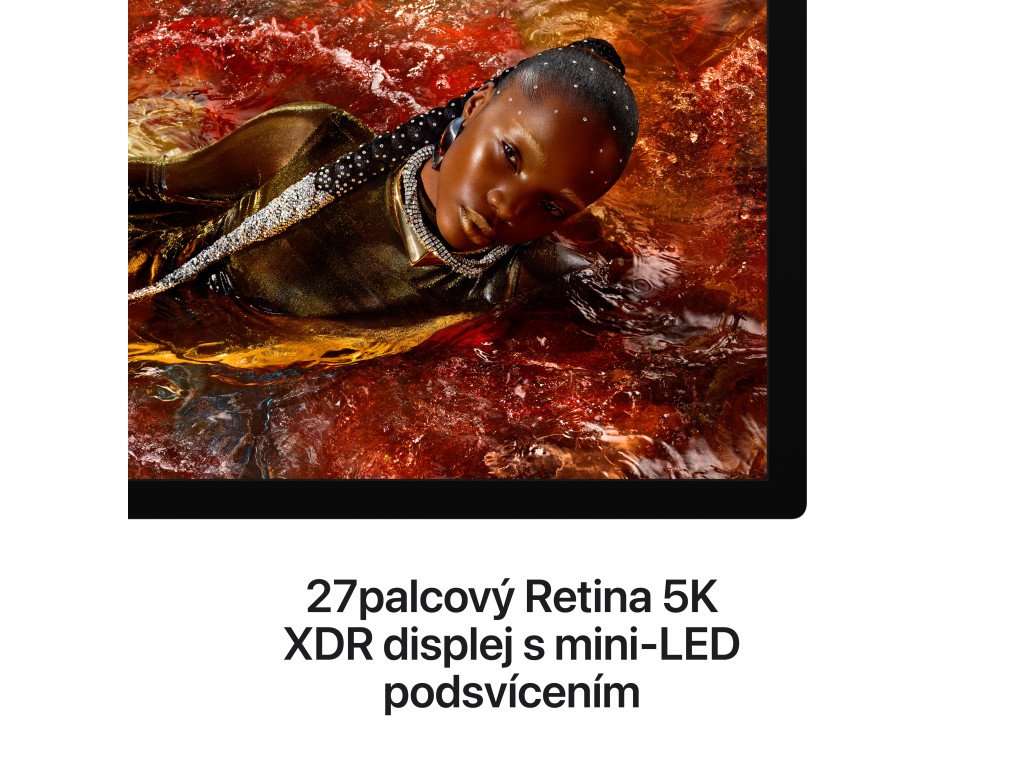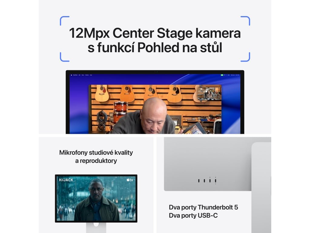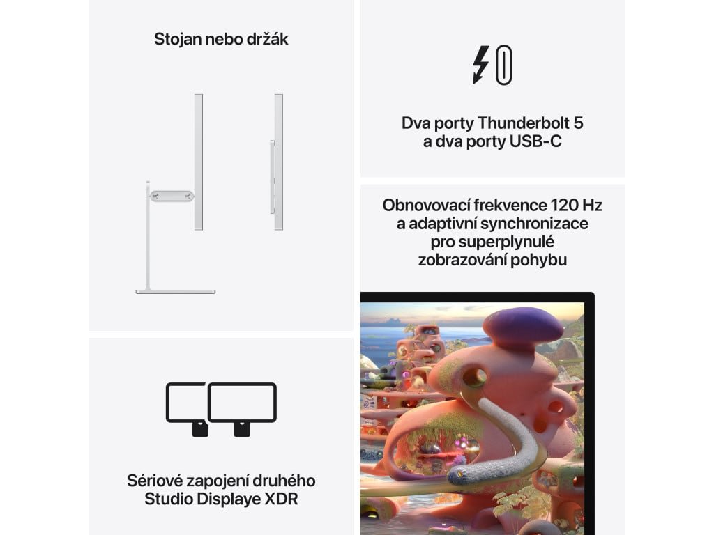 IPS monitor s 5K rozlišením (5120 × 2880, 16:9), 120 Hz, matným mini LED panelem, integrovanou webkamerou, reproduktory a konektivitou přes Thunderbolt.