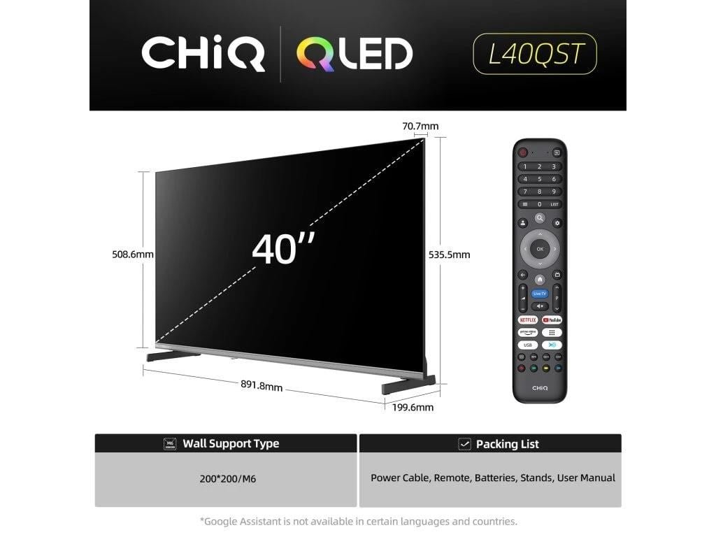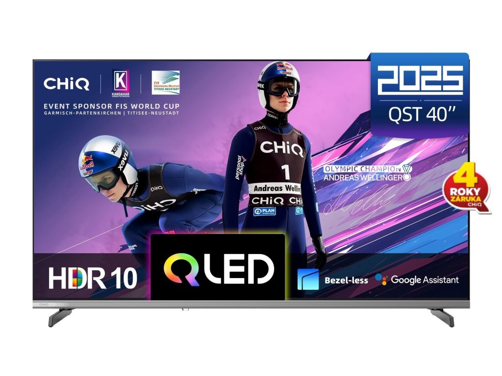 CHiQ L40QST, 40" (100 cm), metalická ultratenká bezrámečková smart QLED Google TV, Full HD, Dolby Audio, dbx-tv, HDR 10, HLG, WiFi 2,4/5G, Bluetooth 5.0, webový prohlížeč, Google Assistant, Chromecast, Oneplay, YouTube, Netflix, en. třída E, atd.