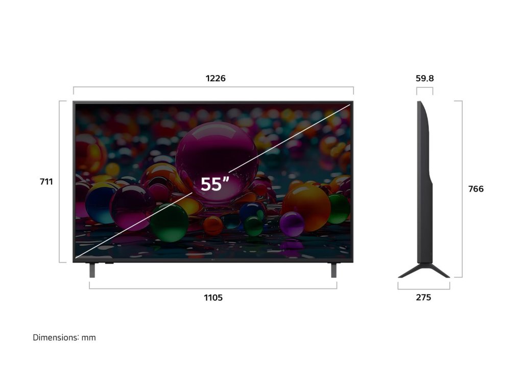 LG 4K UHD TV, 139cm, 4K Ultra HD rozlišení (3840x2160), Podsvícení Direct LED, Procesor a7 4K AI Gen8, HDR podpora - HDR10 PRO a HLG PRO, FILMMAKER MODE, frekvence panelu 50/60 Hz, ThinQ AI (pouze s Magickým ovladačem - Amazon Alexa), podpora Apple AirPlay 2 a HomeKit, DVB-T2/S2/C, H.265/HEVC, 3x HDMI 2.0, 2x USB, CI+, optický vstup, LAN, WiFi, DLNA, Bluetooth, HbbTV, Miracast, web prohlížeč, propojení s mobilem, eARC, ?7 AI Sound PRO (virtual 9.1.2 k up-mix), 2.0 k 20 W, Připraveno pro Bluetooth surround, nahrávání TV, Herní režim, HGiG, ALLM, webOS Smart TV, Dálkový ovladač L-con, VESA 300x200B, Energetická tř. G