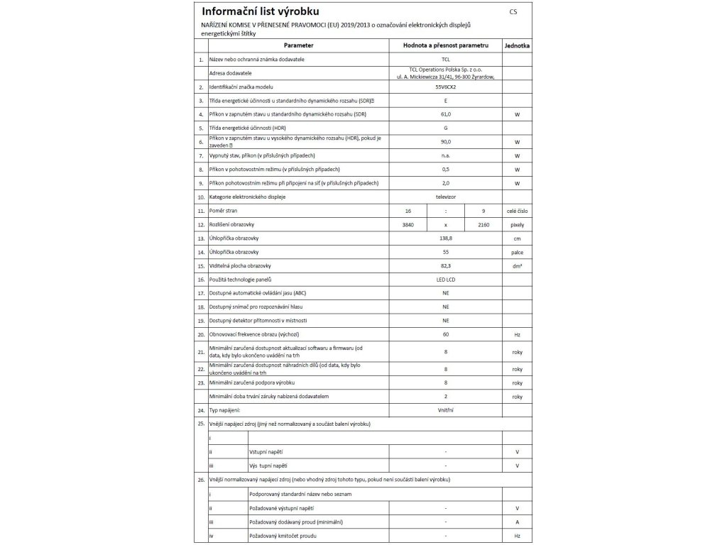 Televize TCL 55V6C, 140cm, UHD, 60Hz, LED, HDR10, HLG, DVB-T2/S2/C, 2500PPI, Dynamic color, repro 2x 10W, HbbTV, Google TV