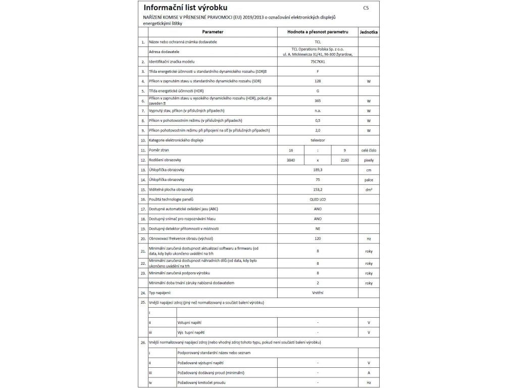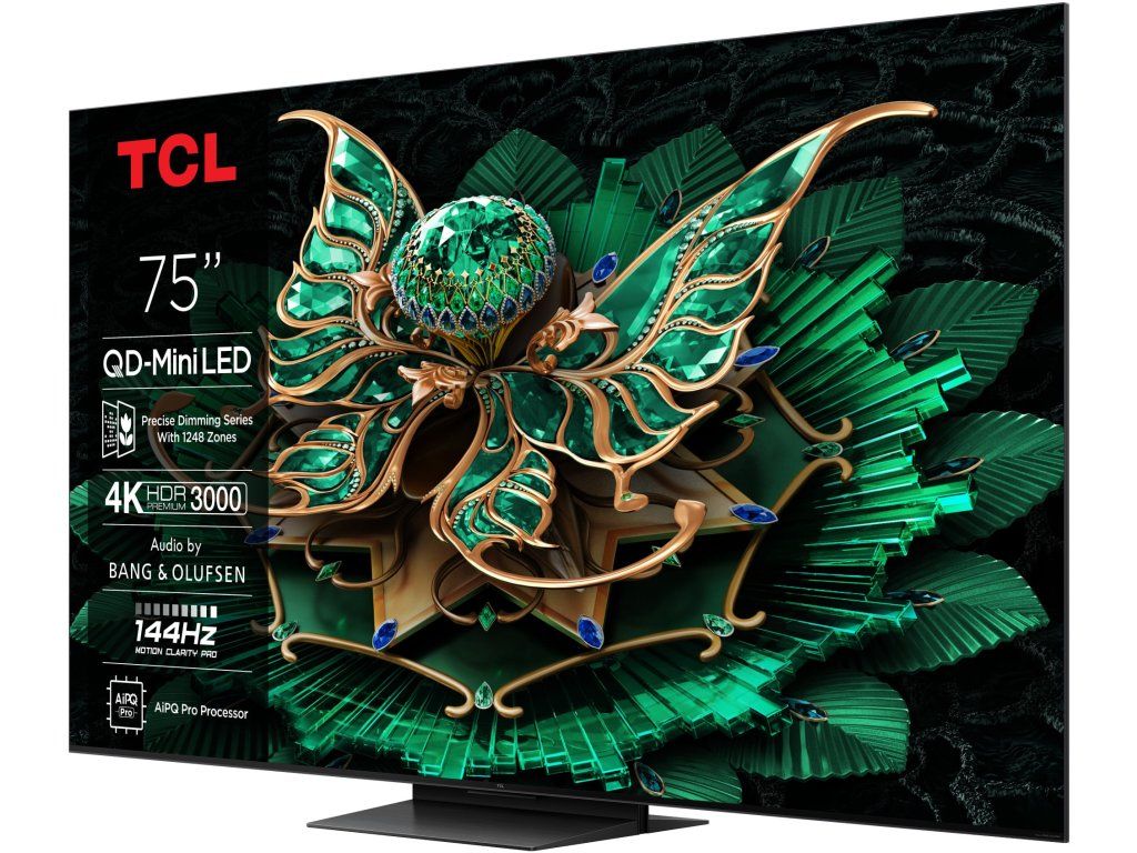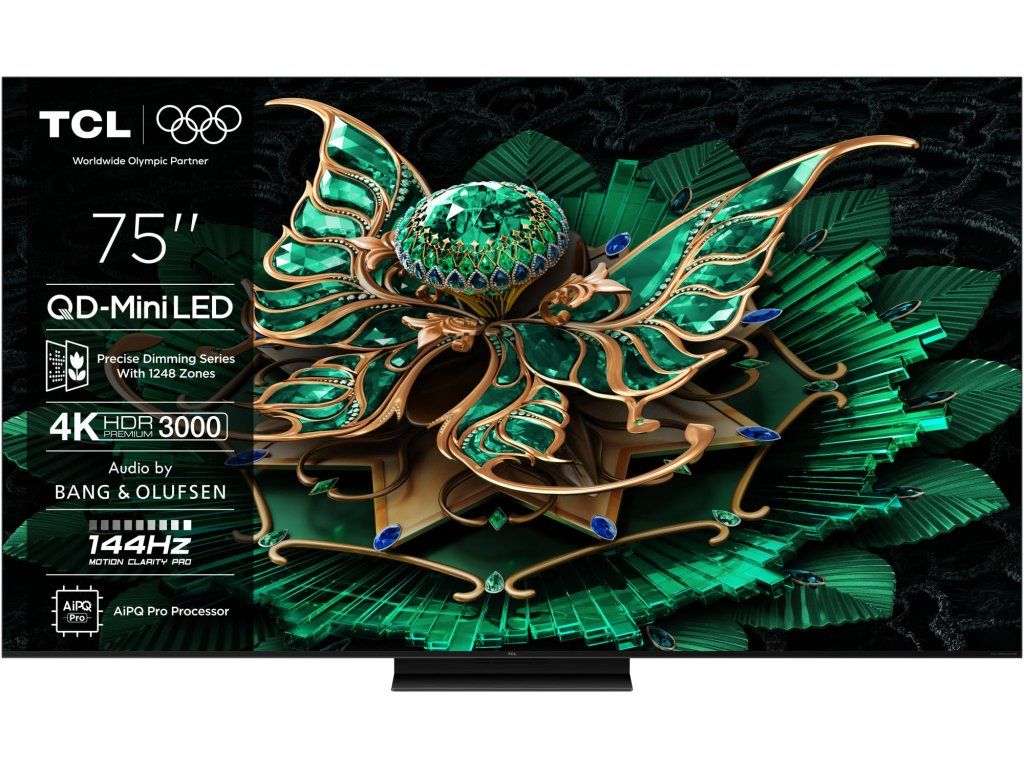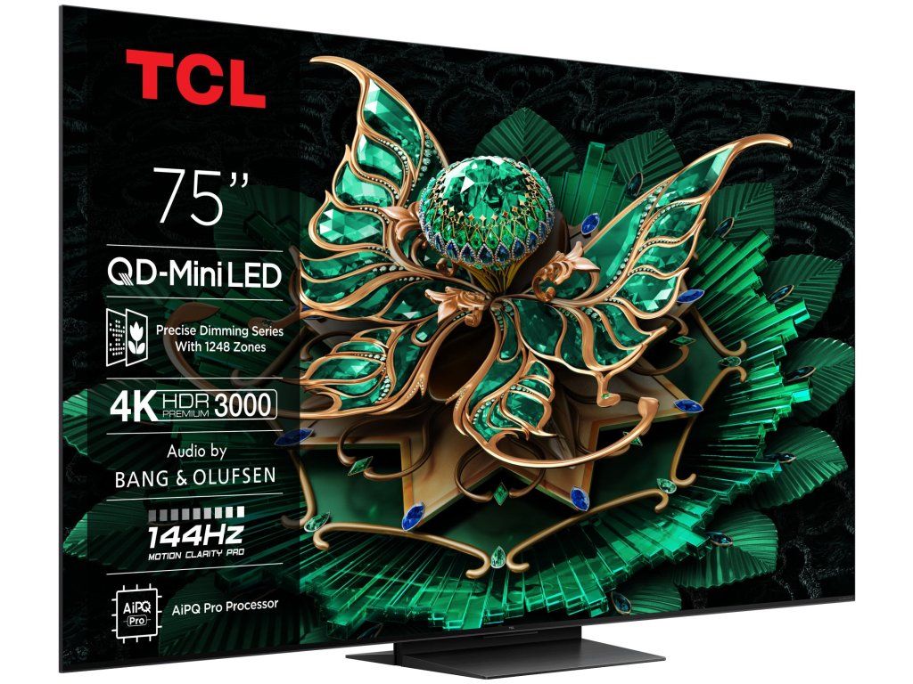 Televize TCL 75C7K Google TV, Mini LED, 191cm, 4K Ultra HD, 100/120 Hz (144 Hz – herní režim), HDR10+, Dolby Vision, lokální stmívání, antireflexní obraz, DVB-T2/S2/C, 4× HDMI, 1× USB, LAN, WiFi, Bluetooth, DLNA, Chromecast, Miracast, HbbTV 2.0.3