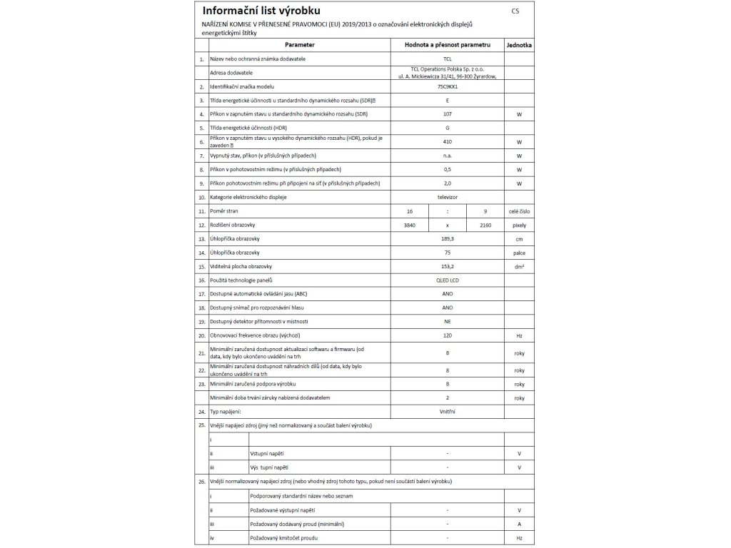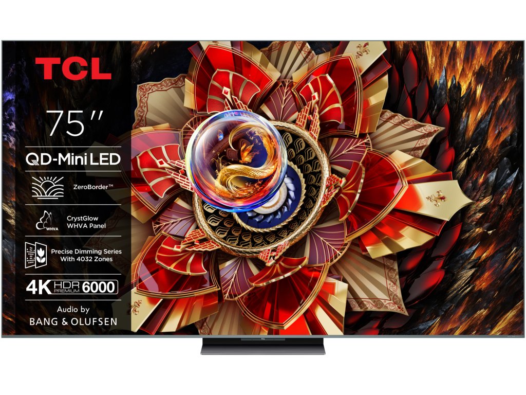 Televize TCL 75C9K Google TV, Mini LED, 191cm, 4K Ultra HD, 100/120 Hz (144 Hz–herní režim), HDR10+, 6000 nits, Dolby Vision, lokální stmívání, antireflexní obraz, DVB-T2/S2/C, 4× HDMI, 1× USB, LAN, WiFi, Bluetooth, DLNA, Chromecast, Miracast, HbbTV 2.0.3