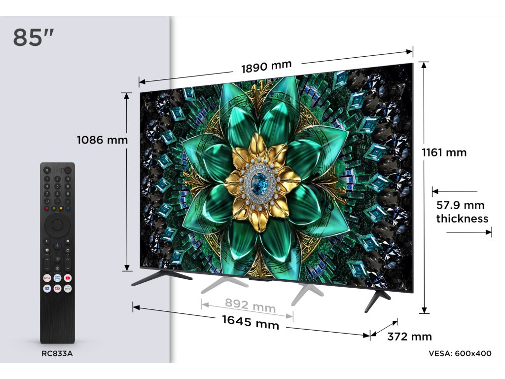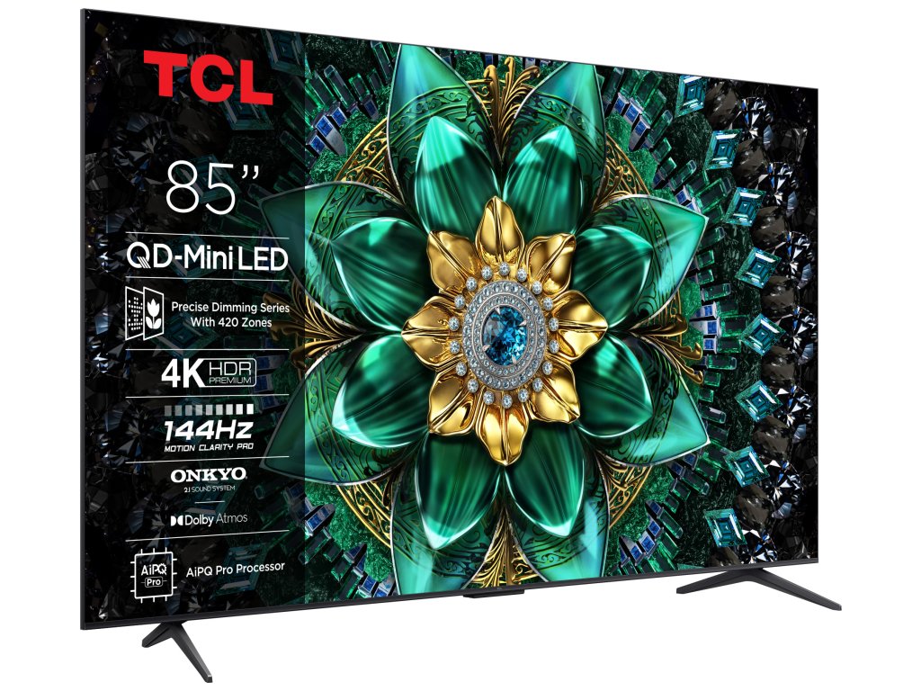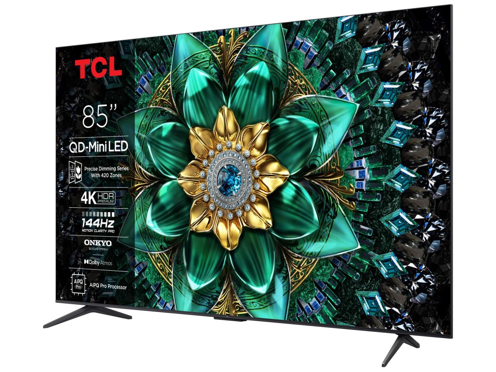 TCL 85Q6C Google TV, Mini LED, 215cm, 4K Ultra HD, 100/120 Hz (144 Hz – herní režim), HDR10+, Dolby Vision, lokální stmívání, antireflexní obraz, DVB-T2/S2/C, 4× HDMI, 1× USB, LAN, WiFi, Bluetooth, DLNA, Chromecast, Miracast, HbbTV 2.0.3, herní režim