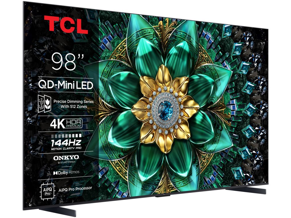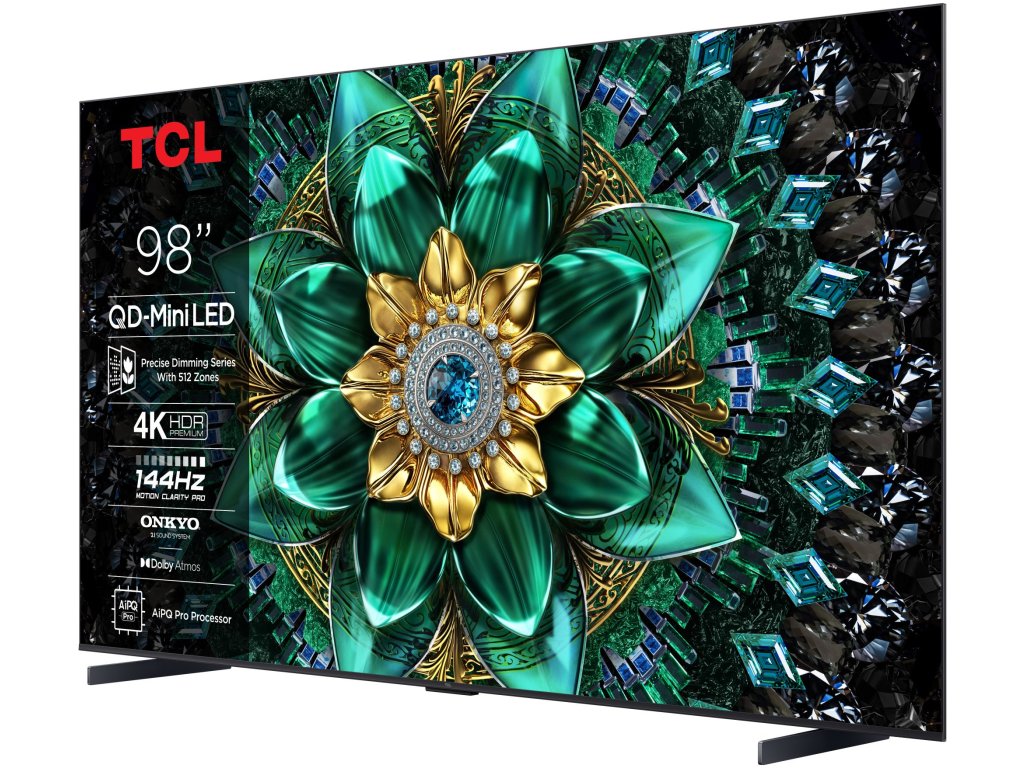 TCL 98Q6C Google TV, Mini LED, 249cm, 4K Ultra HD, 100/120 Hz (144 Hz – herní režim), HDR10+, Dolby Vision, lokální stmívání, antireflexní obraz, DVB-T2/S2/C, 4× HDMI, 1× USB, LAN, WiFi, Bluetooth, DLNA, Chromecast, Miracast, HbbTV 2.0.3, herní režim