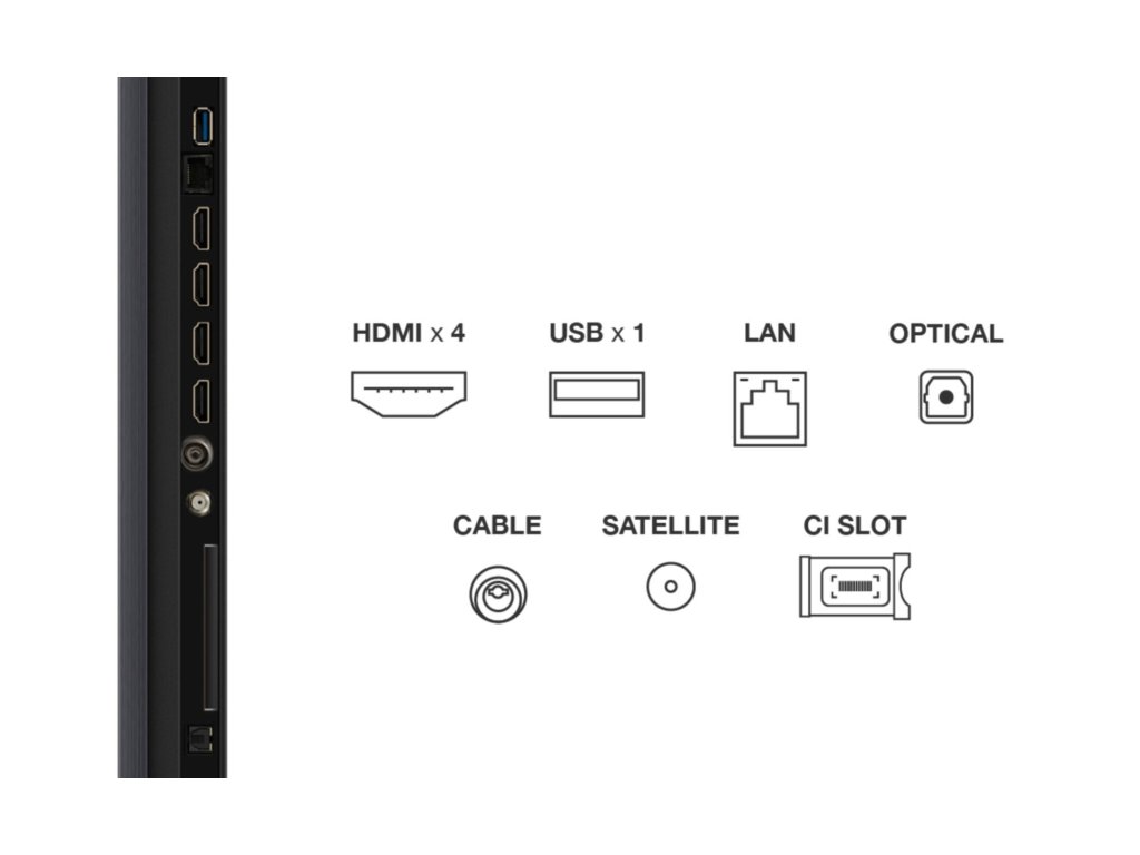 Televize – Google TV, Mini LED, 249cm, 4K Ultra HD, 100/120 Hz (144 Hz – herní režim), HDR10+, Dolby Vision, lokální stmívání, antireflexní obraz, DVB-T2/S2/C, 4× HDMI, 1× USB, LAN, WiFi, Bluetooth, DLNA, Chromecast, Miracast, HbbTV 2.0.3, herní režim, hlasové ovládaní, Google Assistant, Apple Airplay 2, párování s mobilním zařízením, Oneplay, VESA 600×400, repro 40 W, DTS:X, DTS Virtual:X, Dolby Atmos, Prostorový zvuk, vestavěný subwoofer, energetická třída E
