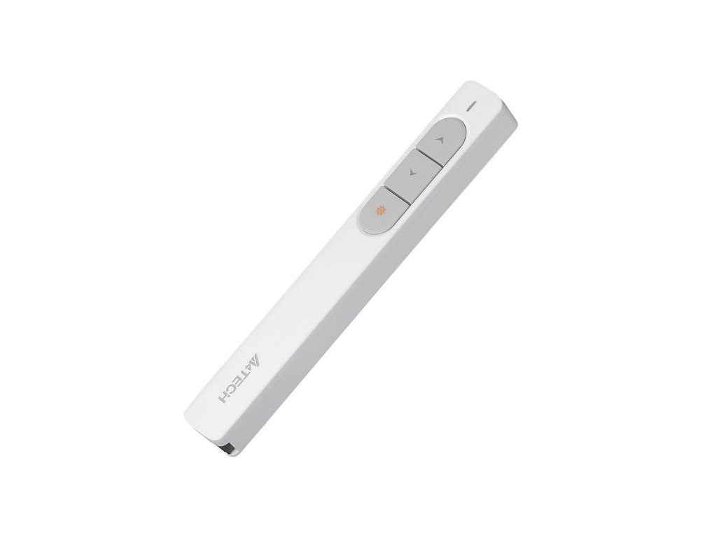 Ovladač prezentací a červené laserové ukazovátko, bezdrátový, konektor USB, napájení 1× AA, dosah laserového ukazovátka 100 m, bílý.