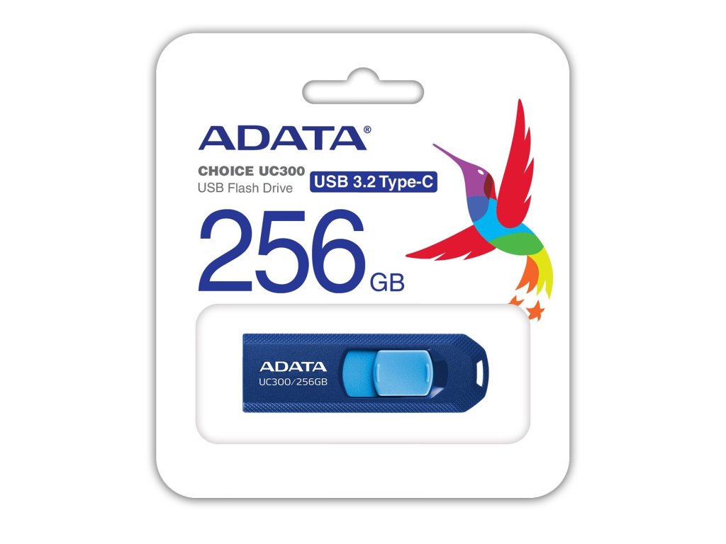 Adata UC300, USB disk, flash memory, kapacita 256GB, USB 3.2 Gen1, kompatibilní s USB 2.0, konektor USB-C, modrý