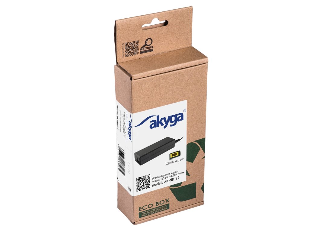 Akyga® AK-ND-29 je 90W napájecí adaptér je kompatibilní s každým notebookem s napájením 20V, až do 4.5A a konektorem Slim Tip (také známý jako Square yellow).