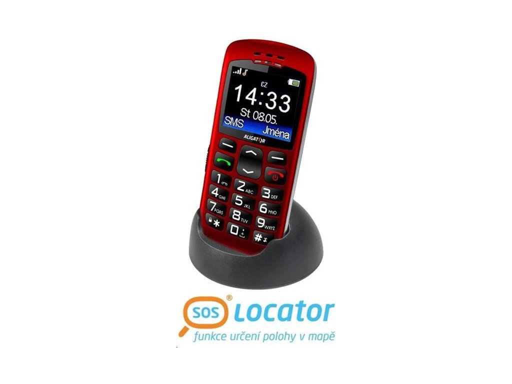 Mobilní telefon Aligátor s velkým 2,2" TFT displejem, 220x176, VGA fotoaparát, Bluetooth, MicroSD, FM rádio, SOS tlačítko, SOS LOCATOR, stolní nabíječka v balení, vestavěná svítilna, barva červená