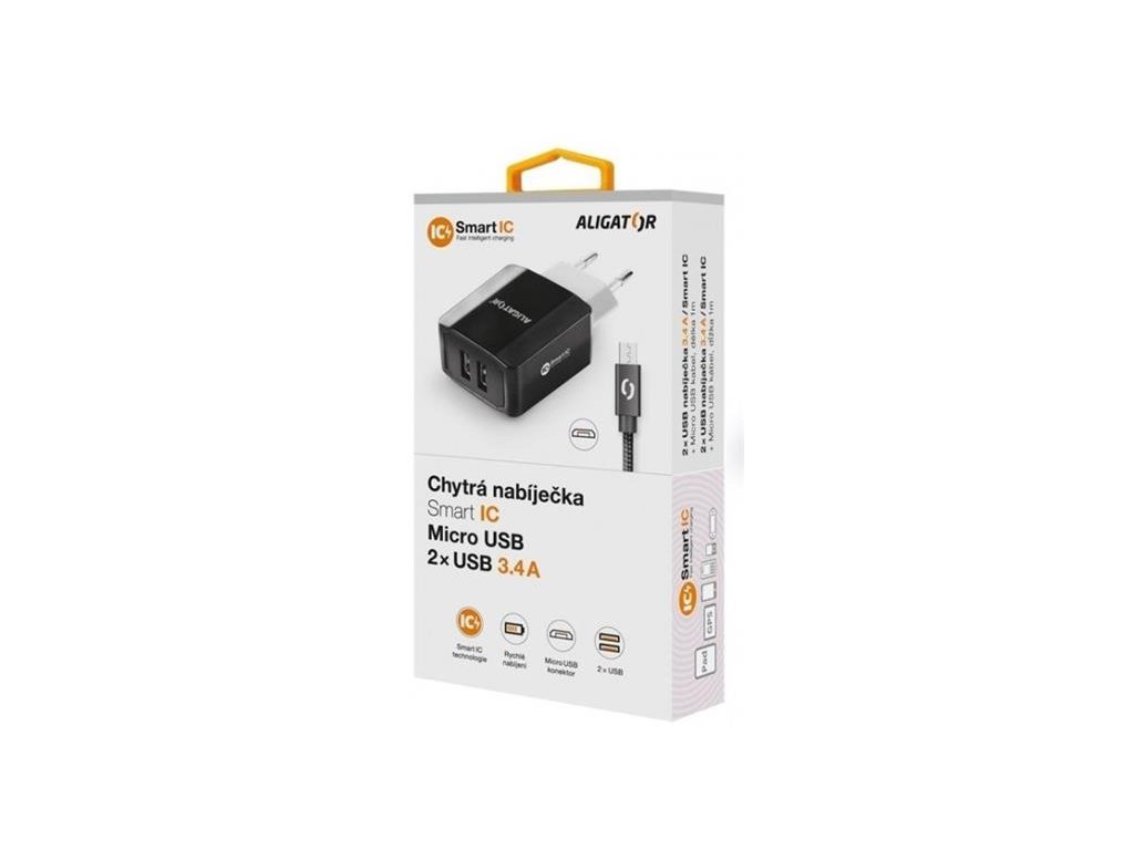Chytrá síťová nabíječka ALIGATOR 3.4A, 2xUSB, smart IC, černá, micro USB kabel 2A