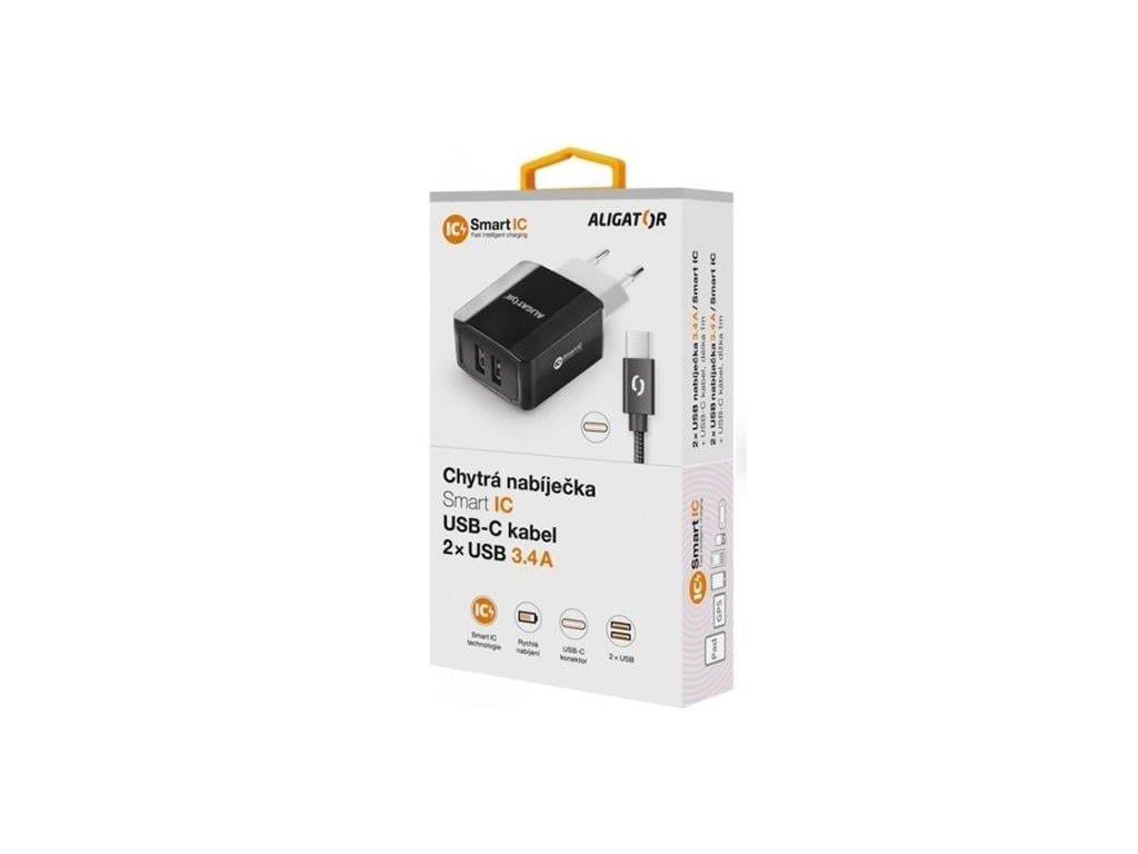 Chytrá síťová nabíječka ALIGATOR 3.4A, 2xUSB, smart IC, černá, USB-C kabel 2A