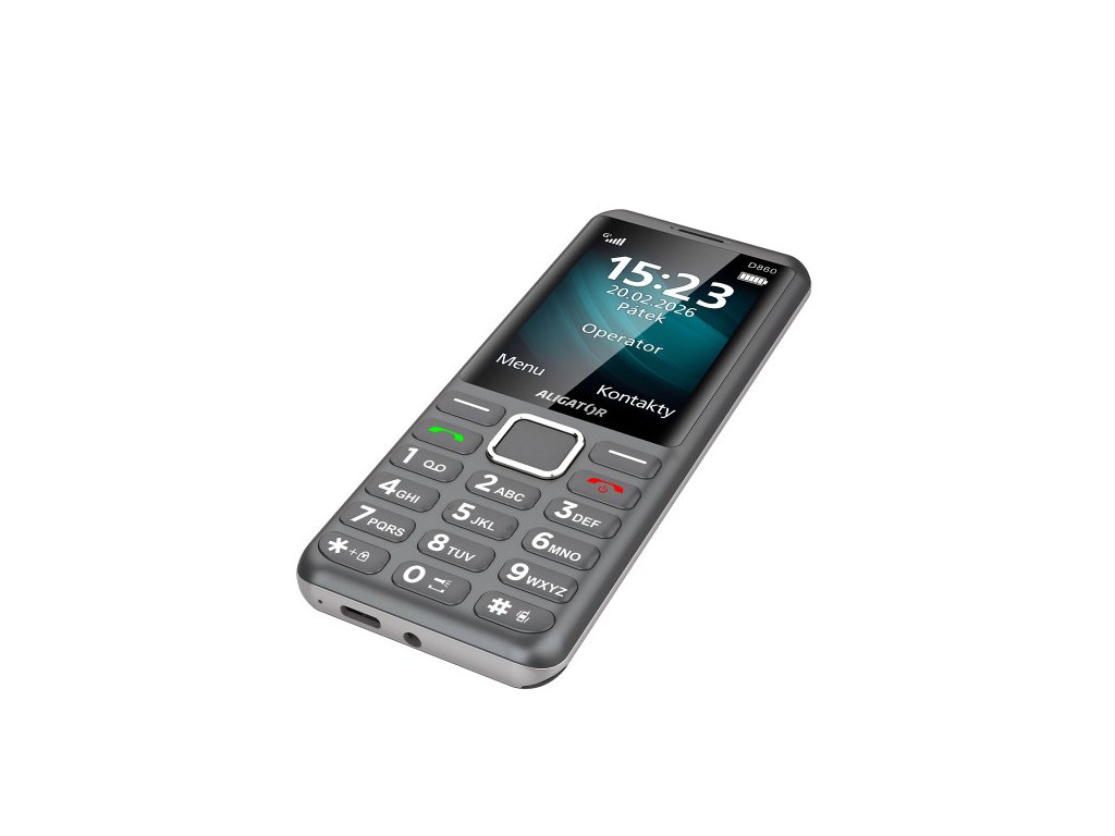 Aligator D860 Dual Sim, displej 2,8" 240x320 px, výdrž v pohotovostním režimu až 10 dnů, paměť na 500 kontaktů, SOS tlačítko
