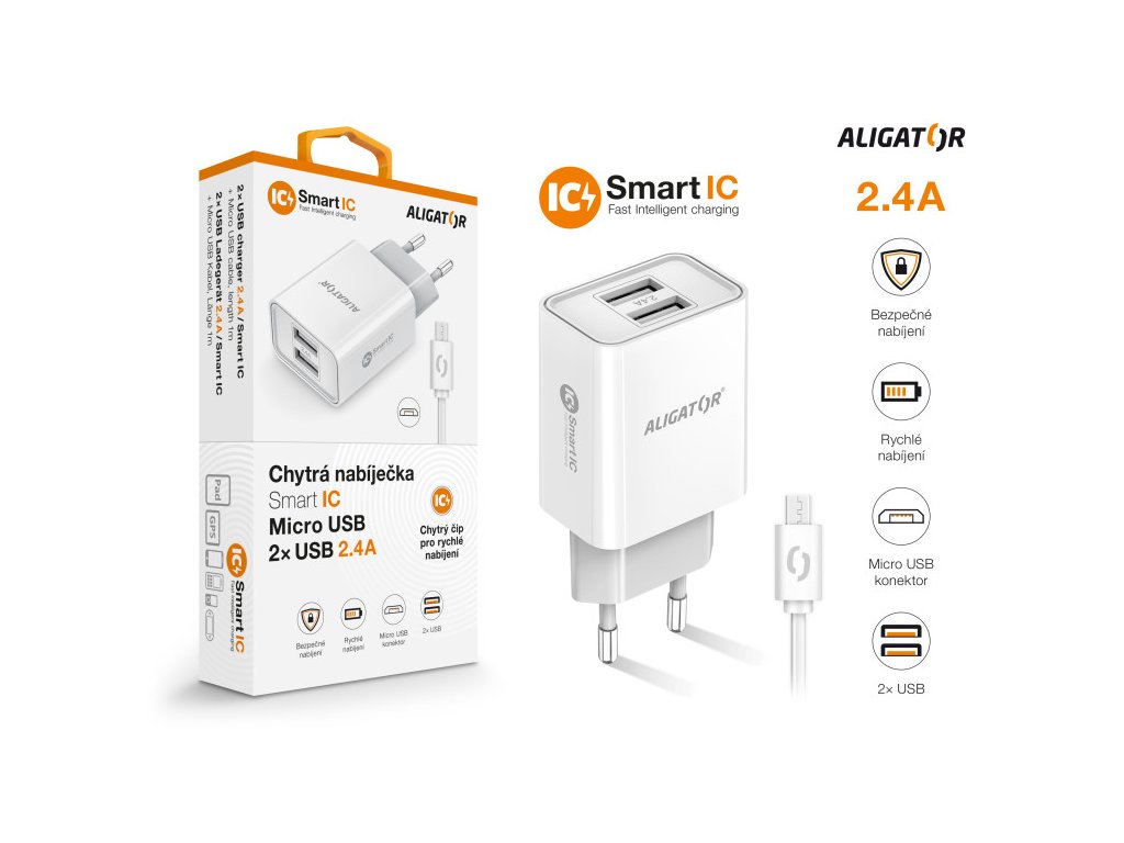 Chytrá síťová nabíječka ALIGATOR 2.4A, 2xUSB, smart IC, bílá, Micro USB kabel 2A