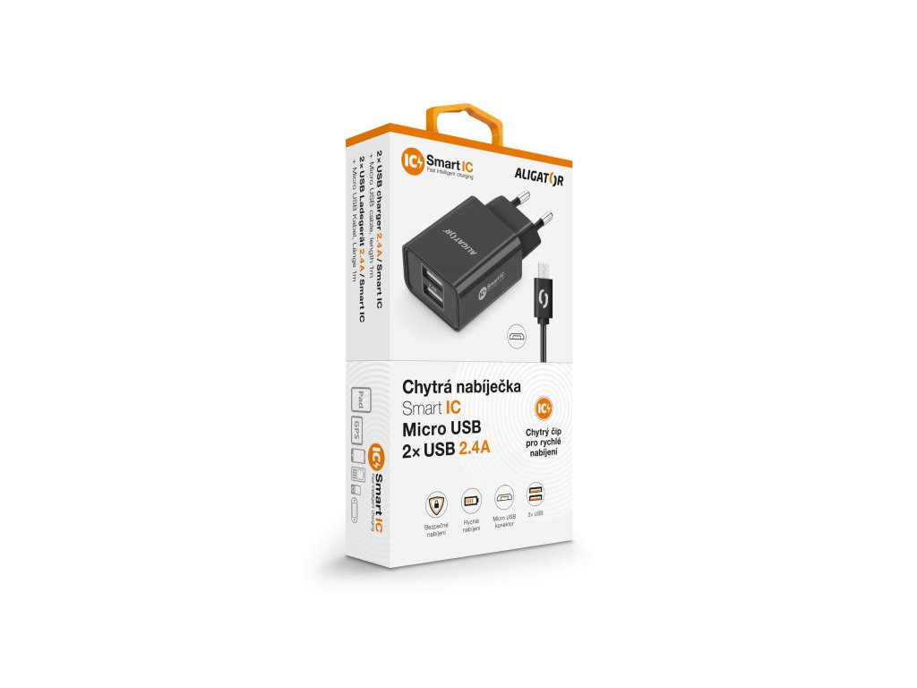 Chytrá síťová nabíječka ALIGATOR 2.4A, 2xUSB, smart IC, černá, Micro USB kabel 2A