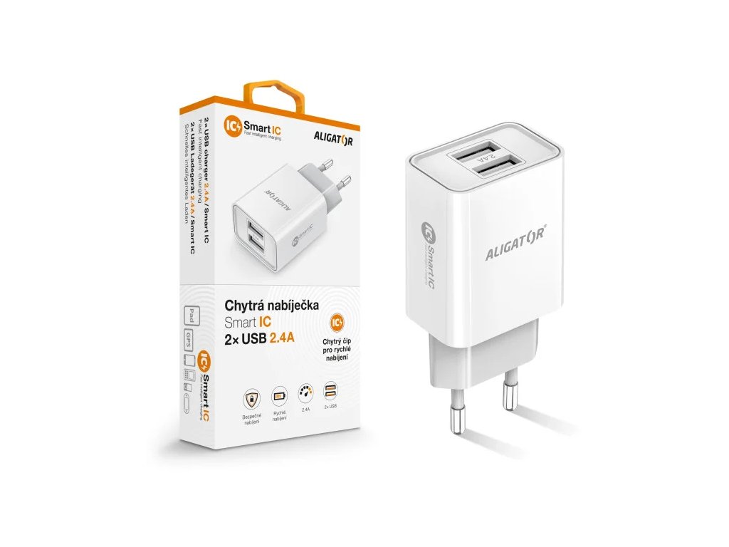 Chytrá síťová nabíječka ALIGATOR 2.4A, 2xUSB, smart IC, bílá