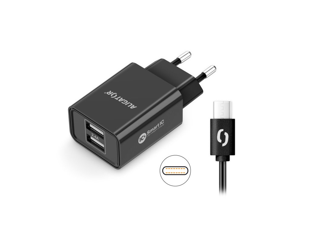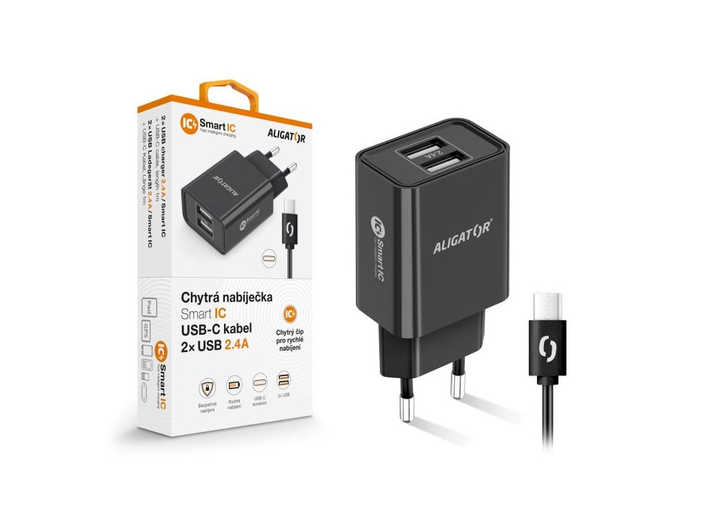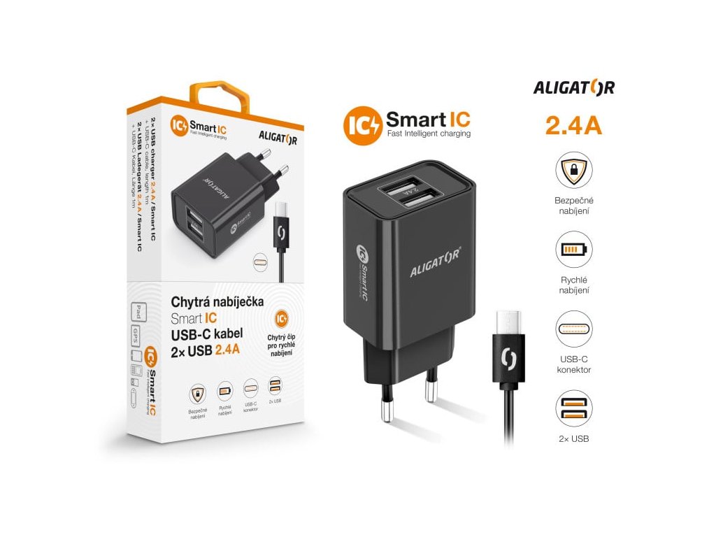 Chytrá síťová nabíječka ALIGATOR 2.4A, 2xUSB, smart IC, černá, USB-C kabel 2A