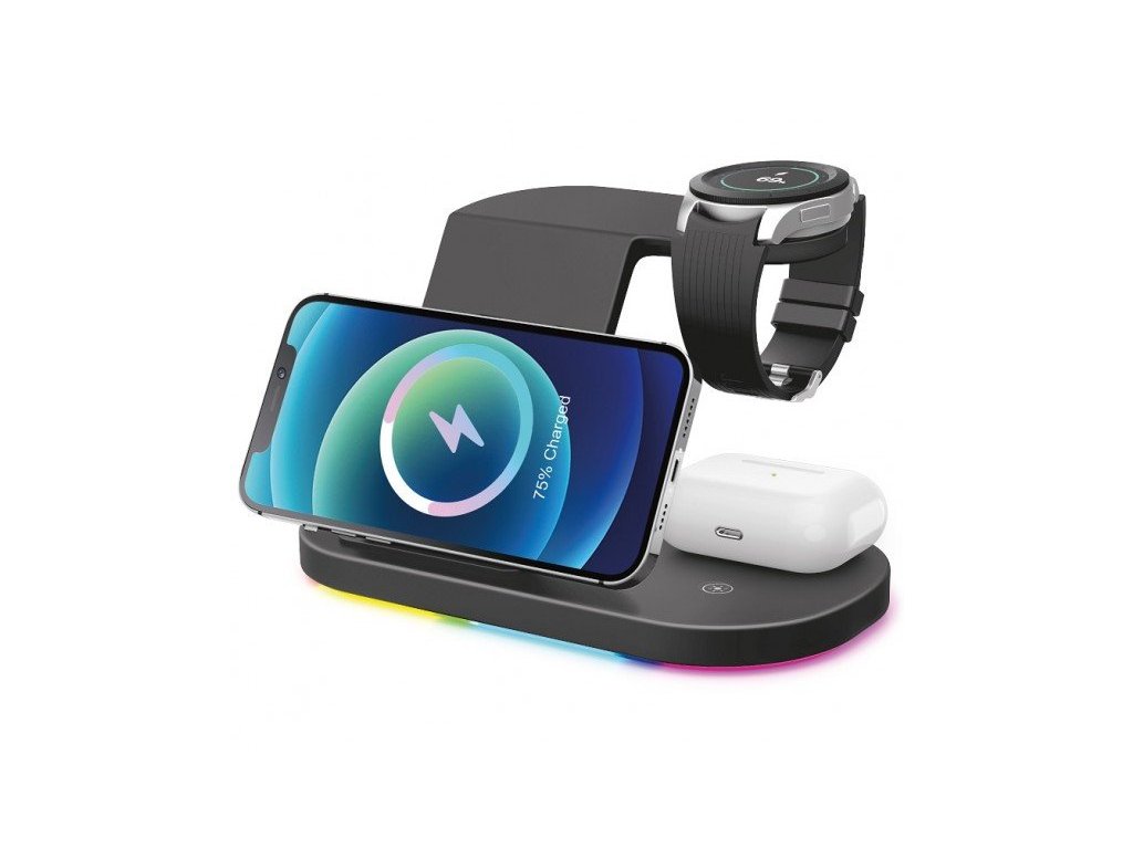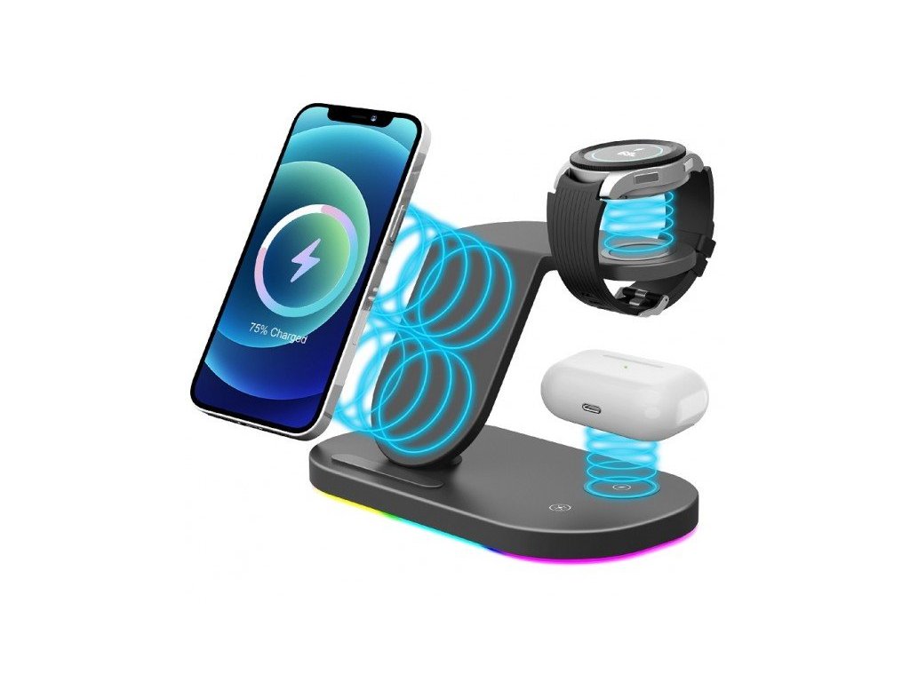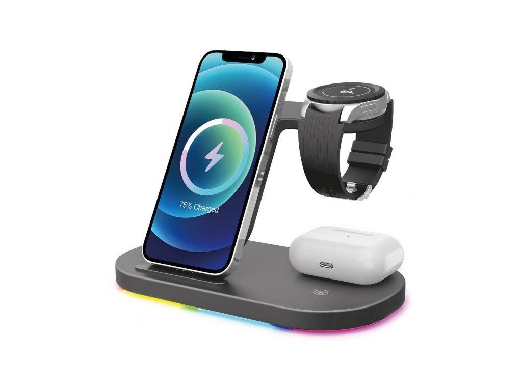 Bezdrátová stanice s podporou rychlého bezdrátového nabíjení o výkonu 15W. Hravě a bezdrátově nabije Váš mobilní telefon, TWS sluchátka a hodinky Samsung Watch – a to všechno najednou!