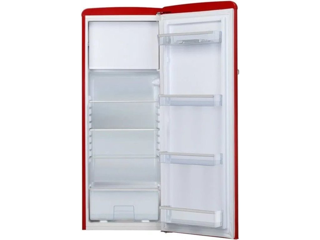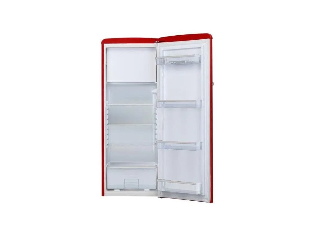 Volně stojící jednodveřová retro lednička, objem 194 / 24 litrů, barva červená, energetická třída E, LED osvětlení, hlučnost 41 dB, šířka 55 cm, výška 144 cm.