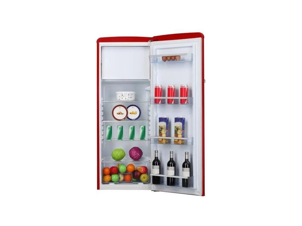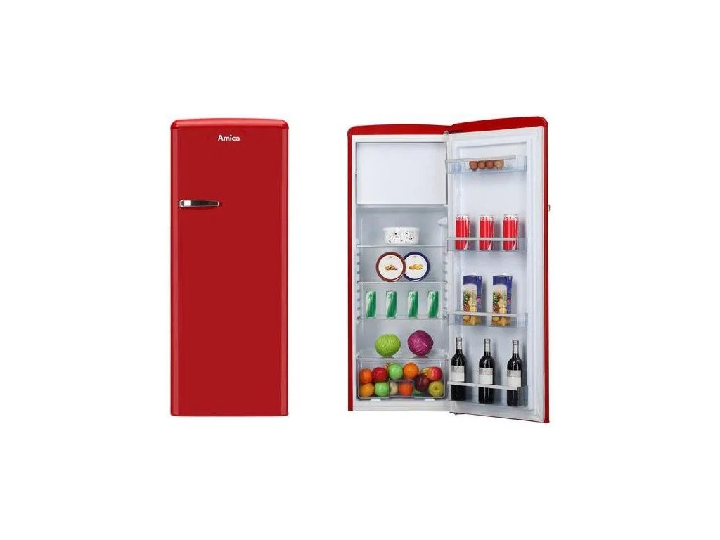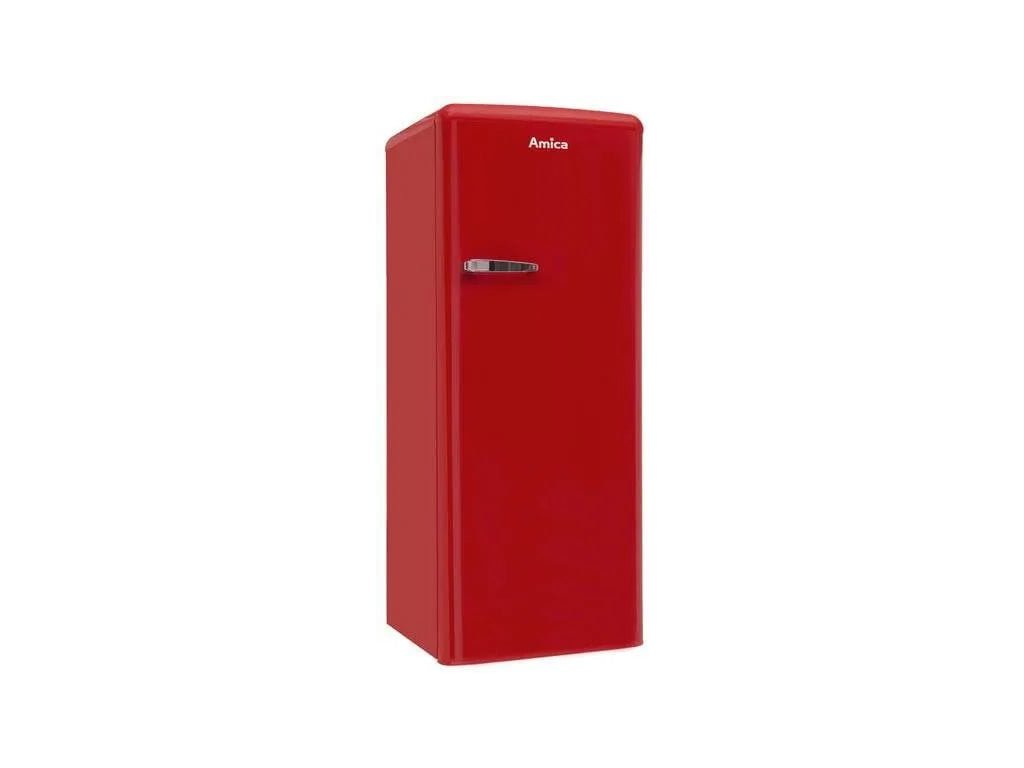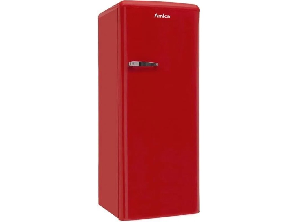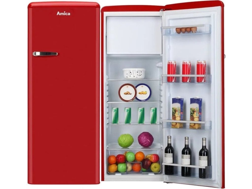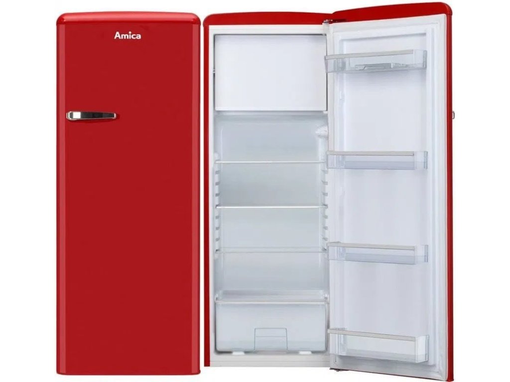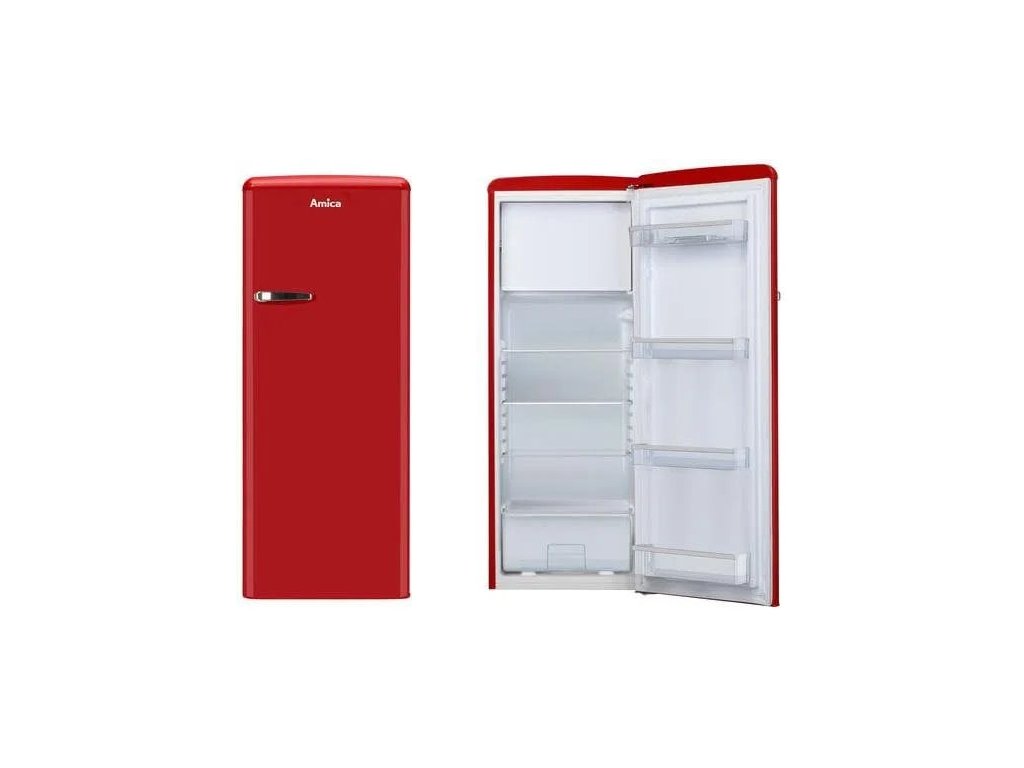 Chladnička AMICA VM 1442 R v červeném retro designu nabízí celkový objem 218 l, z toho 194 l pro chladicí a 24 l pro mrazicí část. Spotřebič patří do energetické třídy E s roční spotřebou 157 kWh a hlučností 41 dB. Uvnitř se nacházejí čtyři police z tvrzeného skla, zásuvka na zeleninu a čtyři dveřní přihrádky. Chladicí část je vybavena automatickým odmrazováním, bočním LED osvětlením a mechanickým ovládáním termostatu.