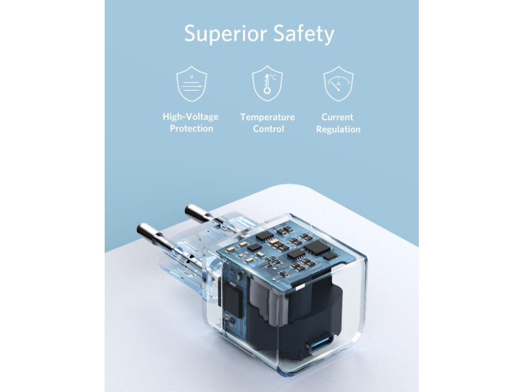 Nabíječka do sítě Anker PowerPort 3, výkon 20W, konektor USB-C, barva bílá, podpora Power Delivery (PD) a PowerIQ 3.0, rozměr: 2,8 × 2,8 × 4 cm, hmotnost: 34 g, modrá LED dioda signalizující správné připojení