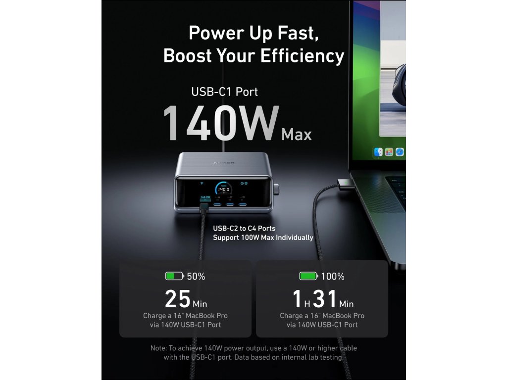 Vysoce účinná nabíječka: Nabijte svůj 16palcový MacBook Pro na 50 % za pouhých 25 minut pomocí prvního portu USB-C, který dodává 140 W pro výrazné zvýšení vaší produktivity.