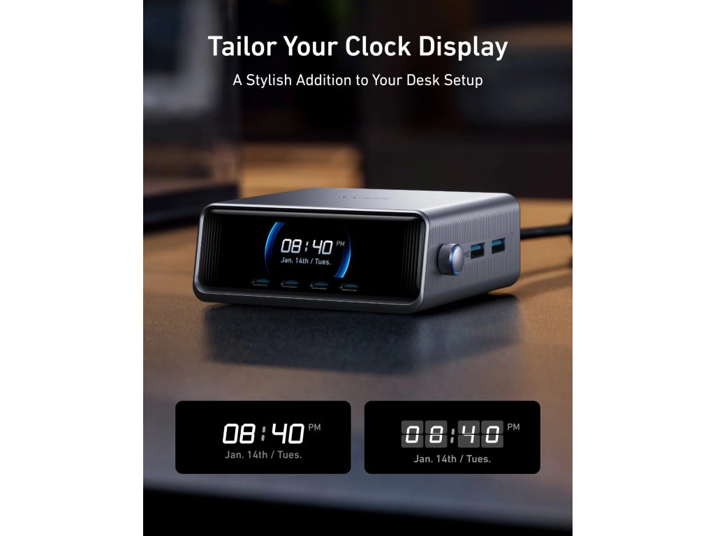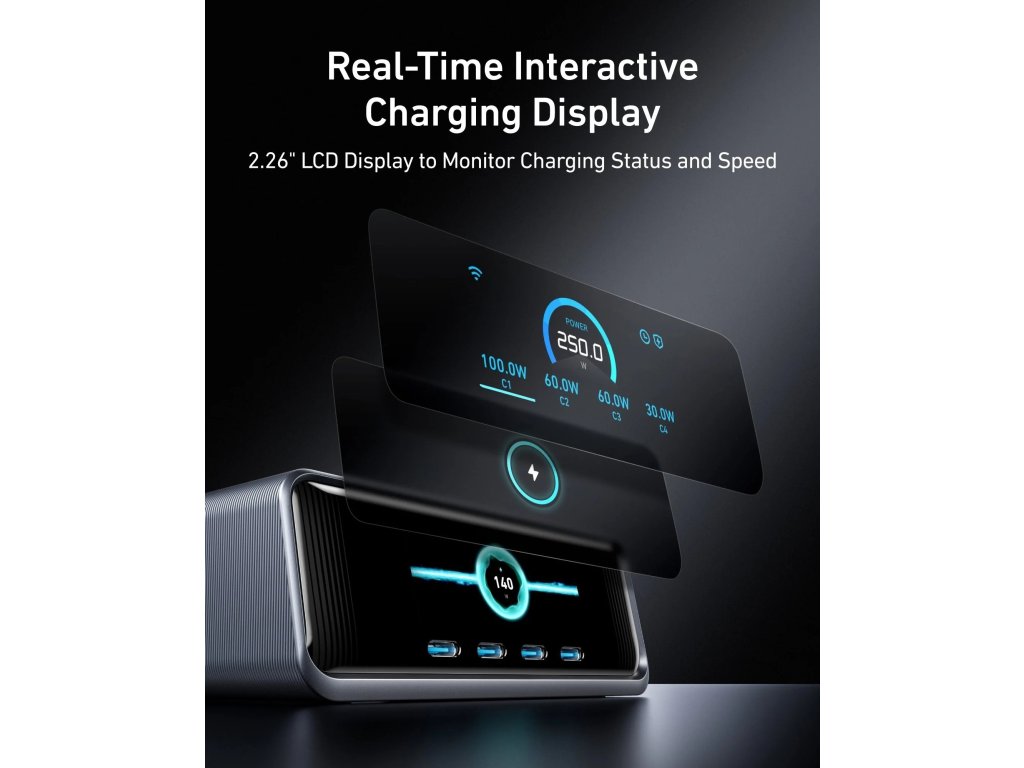 Nabíjecí stanice Anker Prime, výkon 250W, porty 4xUSB-C, 2xUSB, 2,26" LCD displej robrazuje stav a rychlost nabíjení,Technologie GaNPrime a PowerIQ 4.0,nteligentní ovládací volič pro optimalizaci nabíjecího výkonu,ActiveShield 3.0 chrání zařízení před pře