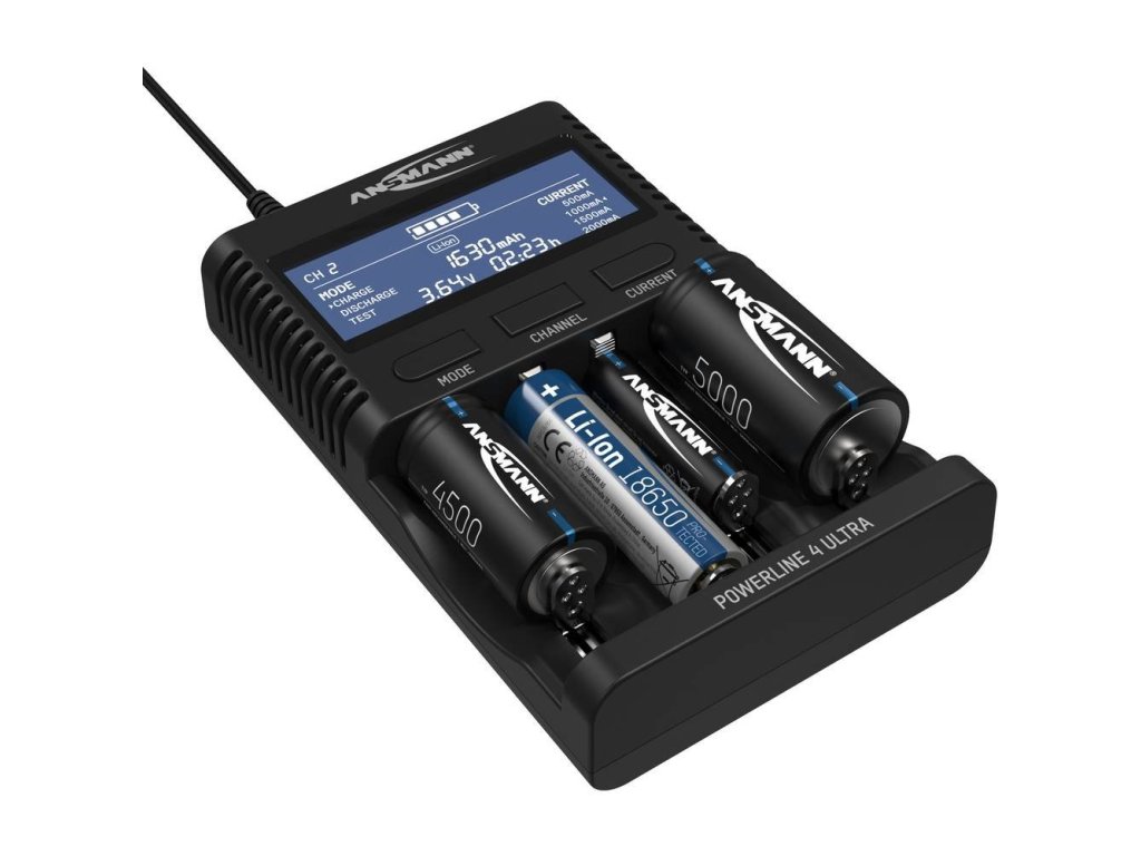 Plně automatická nabíječka - li-ion/NiMHKontrola jednotlivé šachty 1 až 4 akumulátorůPro NiMH AA/AAA/C/D & li-ion 10440 až 26650