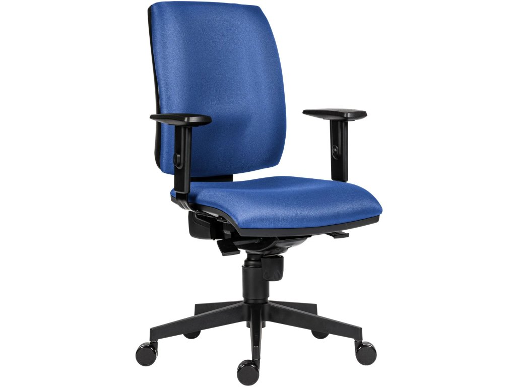 Kancelářská židle s čalouněným sedákem a opěrákem, synchronní mech. s pětinásobnou aretací a posuvem sedáku, černý kříž, výškově stavitelné područky, potah modrý, nosnost 130kg.