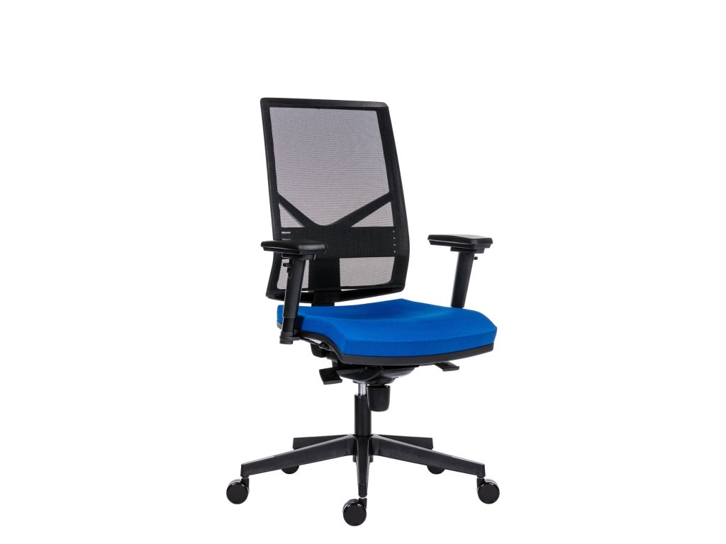 Kancelářská ergonomická židle, opěrák s černou síťovinou s výškově nastavitelnou bederní výztuhou, nastavení výšky opěráku s  uzamykáním, sedák studená pěna vstřikovaná do formy, nastavení výšky sedáku plynovým pístem, synchronní mech. s pětinásobnou aretací a posuvem sedáku, černý kříž, výškově stavitelné područky 3F, nosnost 130kg, potah modrý BN3.