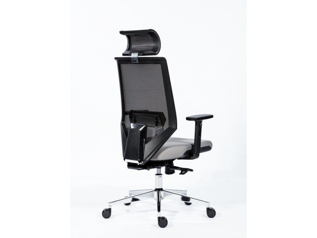 kancelářská židle s úhlově nastavitelným podhlavníkem, opěrák se síťovinou a výškově nastavitelnou bederní výztuhou, nastavení výšky opěráku se systémem up-down, synchronní mechanismus s několikanásobnou aretací a nastavením síly protiváhy, chromovaná ocelová báze, kolečka s průměrem 60 mm univerzálně použitelná pro všechny povrchy, mechanismus SL k nastavení hloubky sedáku, výškově nastavitelné područky s měkkou dotykovou plochou, nosnost 130 kg
