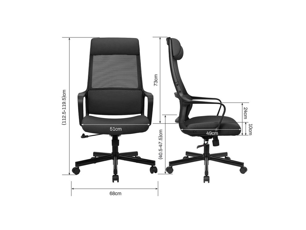 Kancelářská židle s vysokým prodyšným opěrákem, opěrkou hlavy, houpací mechanismus s nastavením síly protiváhy, bederní opěrka a ocelová lakovaná báze, nosnost 120kg
