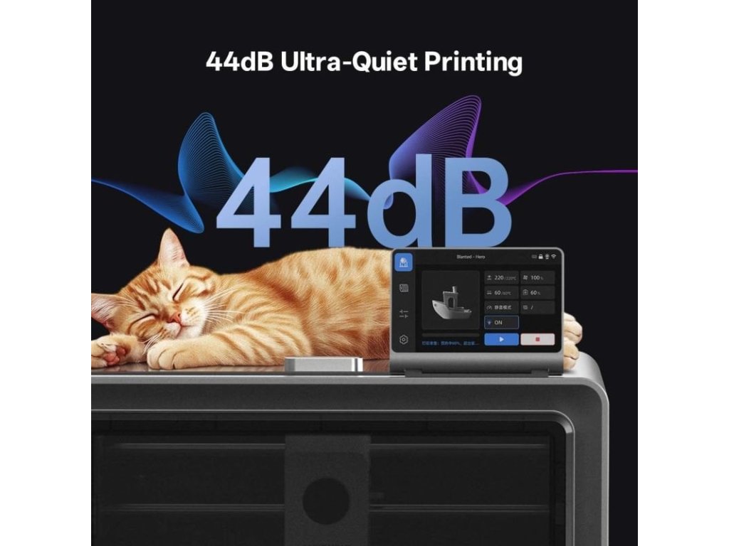 Díky moderní konstrukci dosahuje zařízení rychlosti tisku až 600 mm/s, což výrazně zkracuje výrobní čas. Přesto zůstává provoz ultra tichý (max. 44 dB), takže je ideální i do kanceláří nebo domácí dílny.