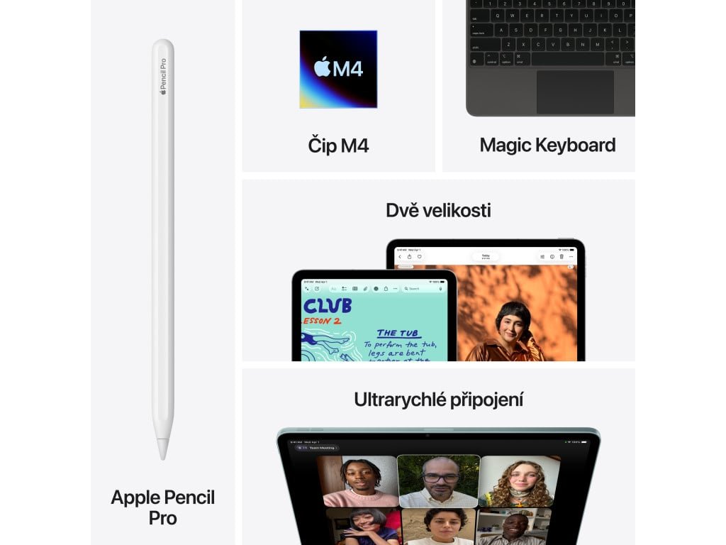 Tablet - displej 11" QHD 2360 × 1640 Liquid Retina, Apple M4 s 9jádrovou GPU, RAM 12 GB, kapacita úložiště 256GB, WiFi, Bluetooth, GPS, 5G, zadní fotoaparát 12 Mpx (f/1,8), přední fotoaparát 12 Mpx (f/2), eSIM, USB-C