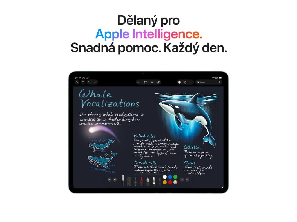 Tablet - displej 13" QHD 2732 × 2048 Liquid Retina, Apple M4 s 9jádrovou GPU, RAM 12 GB, kapacita úložiště 1TB, WiFi, Bluetooth, GPS, 5G, zadní fotoaparát 12 Mpx (f/1,8), přední fotoaparát 12 Mpx (f/2), USB-C