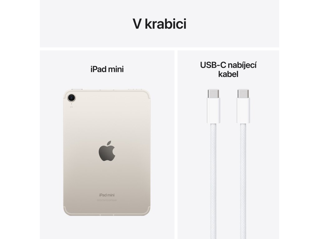 Tablet - displej 8,3" QHD 2266 × 1488 Liquid Retina, Apple A17 Pro, kapacita úložiště 256 GB, WiFi, Bluetooth, GPS, 5G a 4G/LTE, zadní fotoaparát 12 Mpx (f/1,8), přední fotoaparát 12 Mpx (f/2,4), eSIM, USB-C, baterie 5078 mAh, iPadOS 18