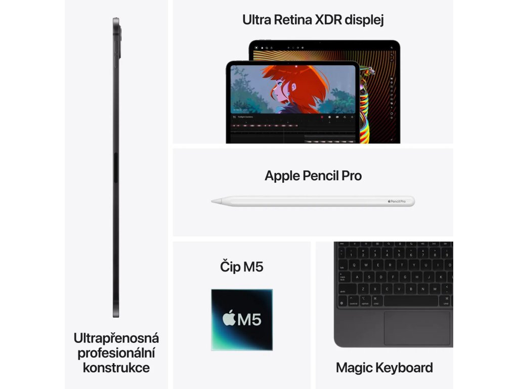 Tablet s 11" QHD Ultra Retina XDR displejem (2420 × 1668), čipem Apple M5 (10jádrová GPU), 16GB RAM, 2TB úložiště, Wi-Fi, Bluetooth, 4G/LTE, 5G, eSIM, 12Mpx fotoaparát, USB-C, 60W nabíjení, iPadOS 26.
