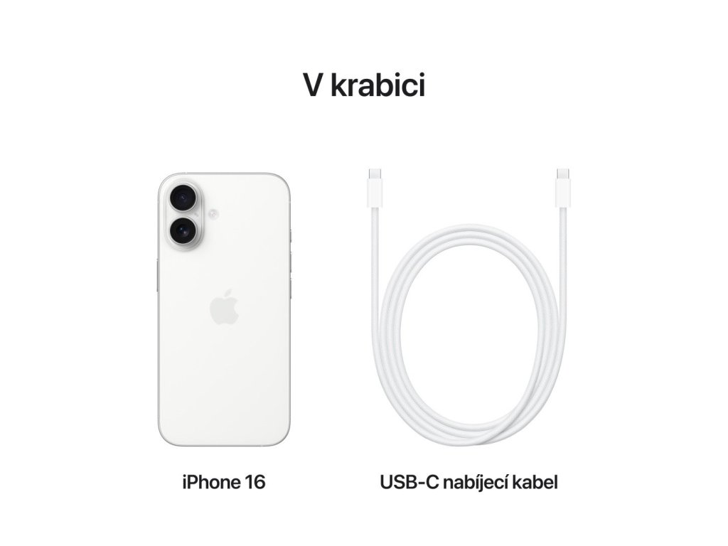 Mobilní telefon, 6,1" Super Retina XDR OLED 2556 × 1179, operační paměť 8 GB, vnitřní paměť 128GB, single SIM + eSIM, procesor Apple A18 Bionic, fotoaparát: 48Mpx (f/1,6) hlavní + 12Mpx širokoúhlý, GPS, NFC, LTE, 5G, USB-C.