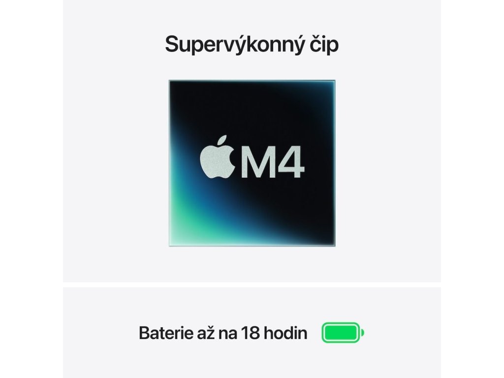Procesor: Apple M4, 10 jádrové CPU (4P+6E), 10 jádrové GPU, 16 jádrový Neural Engine, propustnost 120GB/s