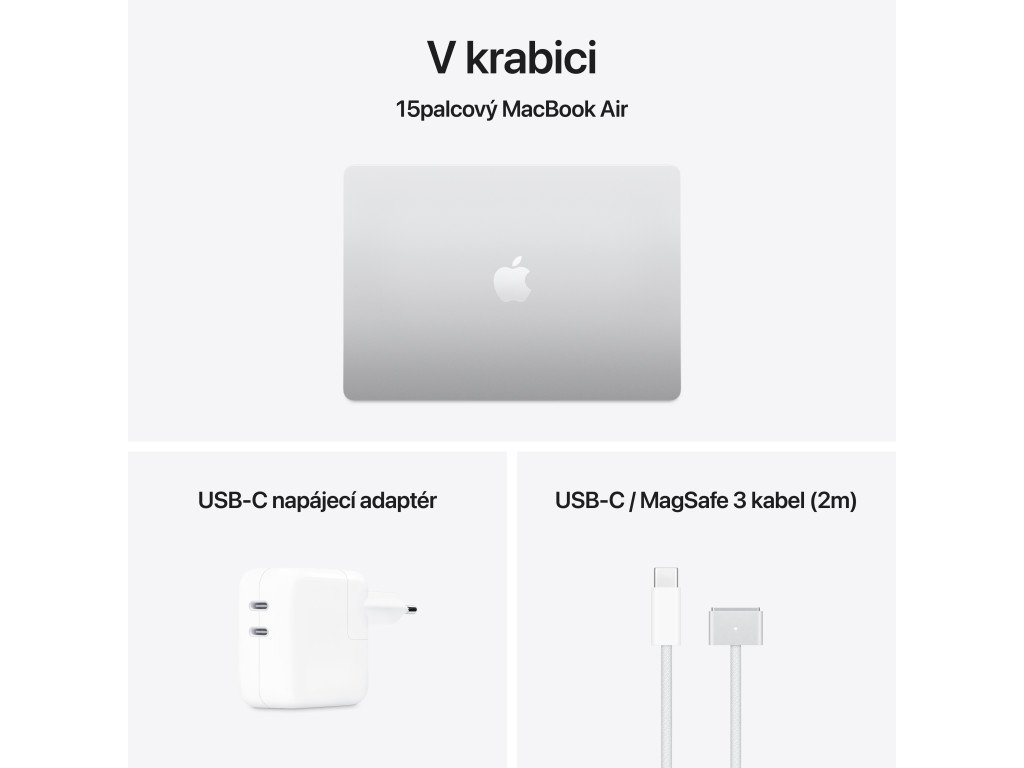 Apple MacBook Air 15 - Apple M4 (10jádrový), 15,3" IPS lesklý 2880 × 1864 px, RAM 16GB, Apple M4 10jádrová GPU, 256GB SSD, webkamera, USB-C, čtečka otisků prstů, WiFi 6, hmotnost 1,51 kg, macOS.