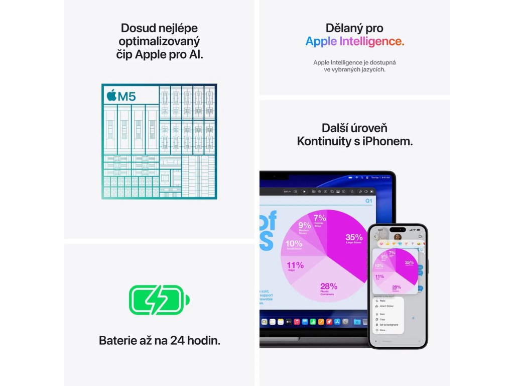 MacBook s čipem Apple M5 (10jádrový), 14,2" Liquid Retina XDR displej 3024 × 1964 px, 120Hz, 24GB RAM, 1TB SSD, 10jádrová GPU, Wi-Fi 6E, čtečka otisků, podsvícená klávesnice, macOS, 1,55kg.