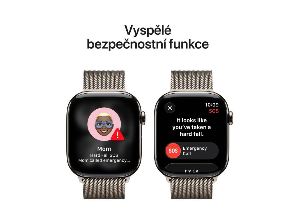 Smartwatch – OLED displej, senzor srdečního tepu, EKG, měření kyslíku v krvi, krokoměr, monitoring spánku, NFC (Apple Pay), Bluetooth, GPS, WiFi, LTE, vodotěsnost 50 m (5 ATM), ovládání v češtině, kompatibilní s iOS.