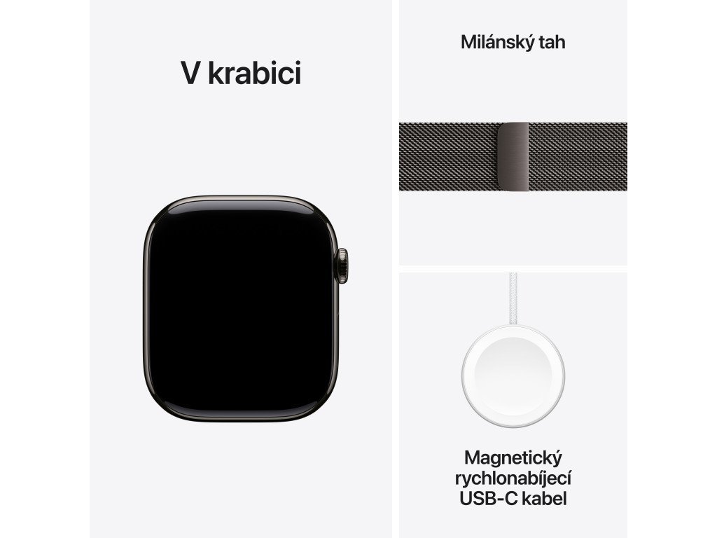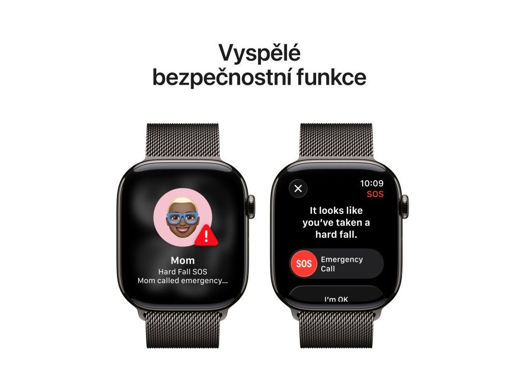 Smartwatch - OLED displej, měření srdečního tepu, EKG, měření kyslíku v krvi, krokoměr, monitoring spánku, NFC (Apple Pay), Bluetooth, GPS, WiFi, LTE, vodotěsnost 50 m (5 ATM), ovládání v češtině, kompatibilní s iOS.