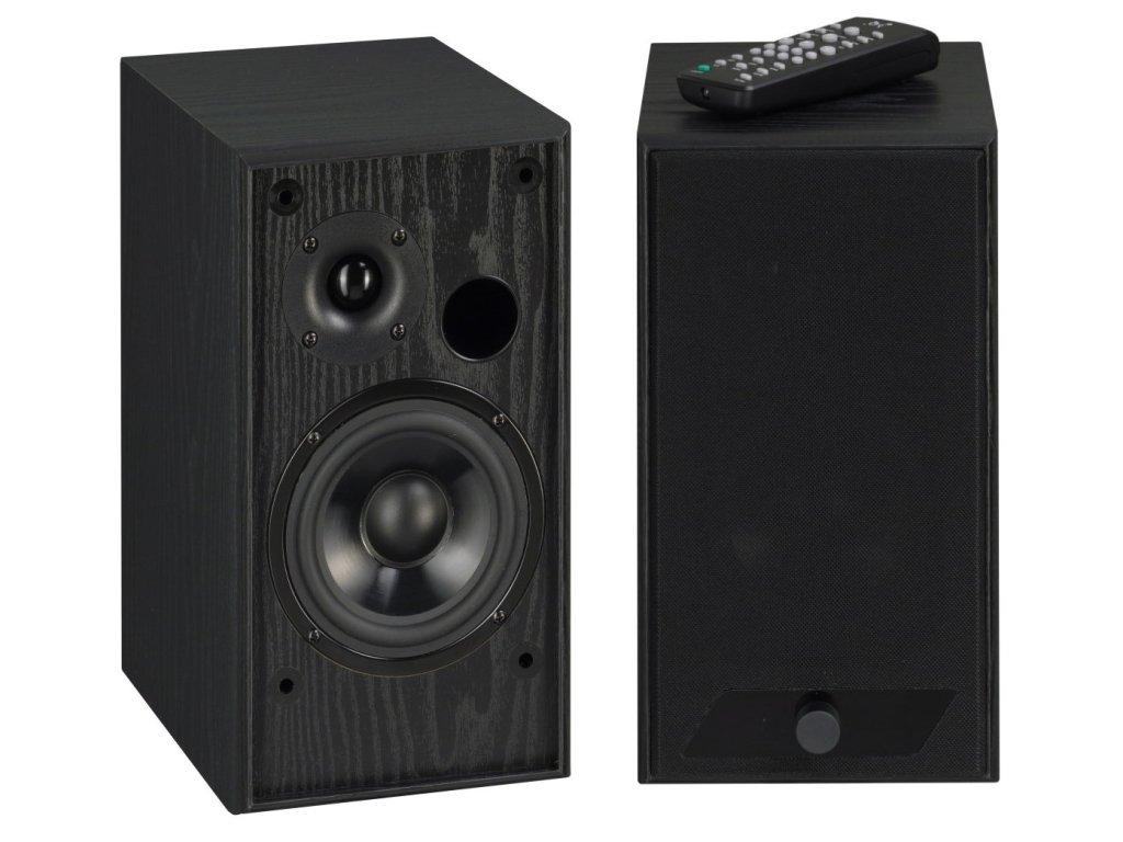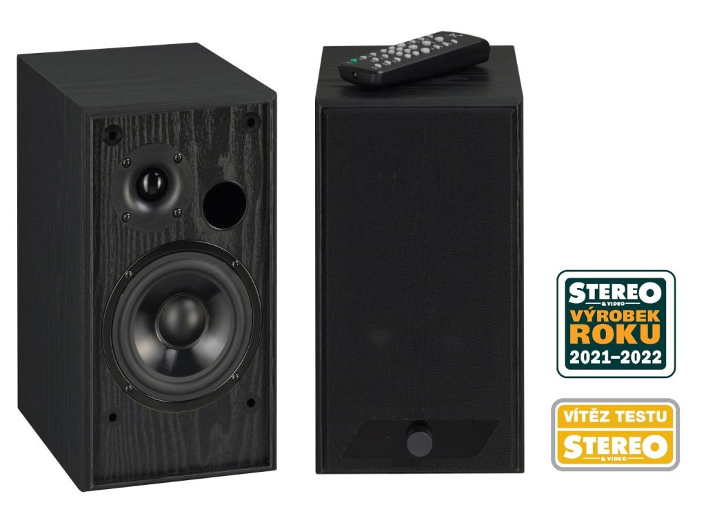 Aktivní HiFi reproduktory, Bluetooth, výkon 2x 30 W, vestavěný zesilovač, RCA výstup, USB-B vstup, dálkový ovladač, černé dřevo