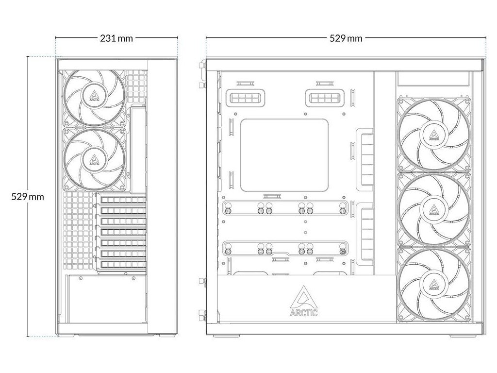 Skříň podporuje instalaci radiátorů až 360/420 mm jak nahoře, tak na boku. Předinstalované ventilátory P12 Pro (vzadu) dosahují 3000 ot./min s průtokem 131 m3/h, zatímco boční P14 Pro Reverse ventilátory nabízejí 166,5 m3/h při 2650 ot./min.