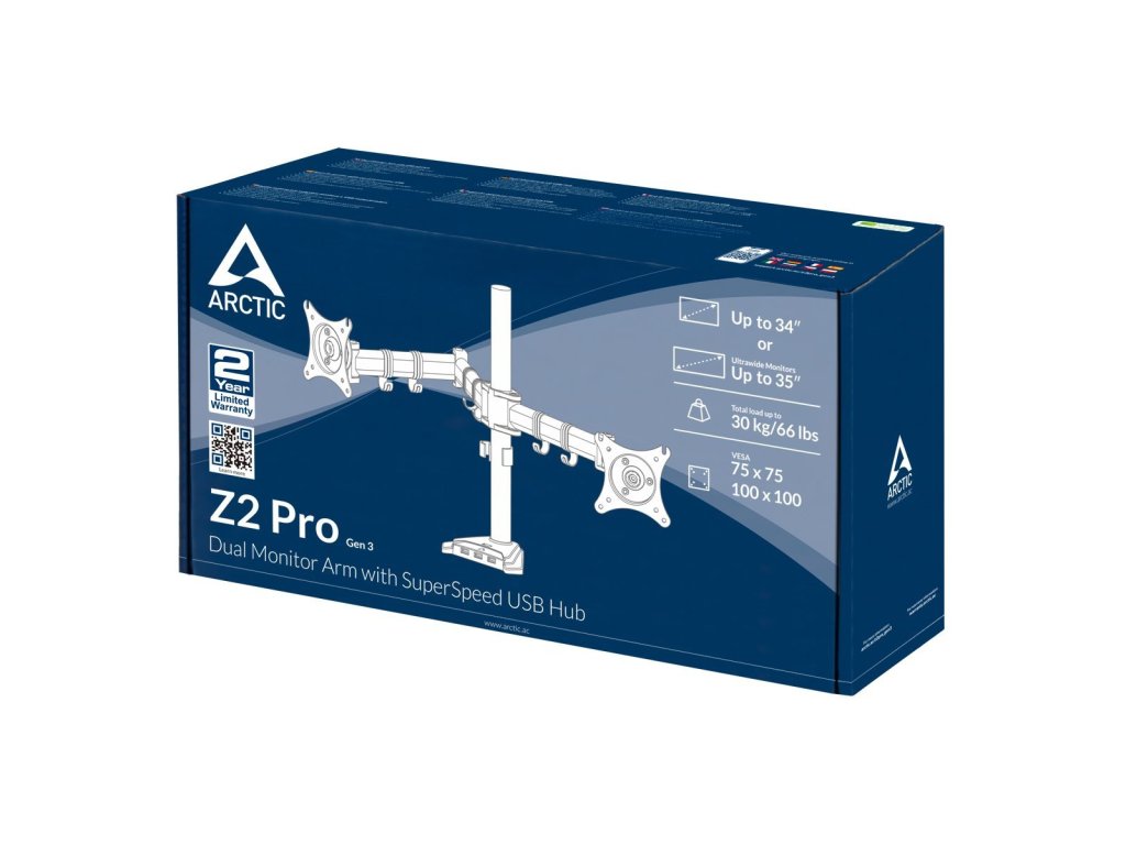 Arctic Z2 Pro Gen 3 je flexibilní držák monitoru se dvěma rameny a čtyř portovým USB 3.0 hubem navržen tak, aby mohla být maximálně využita plocha pracovního stolu a LCD monitor nepřekážel. Ramena lze natáčet ve třech úrovních a rozsahu 360 stupňů pro dosažení maximální ergonomie. Součástí stojanu je rovněž klipsna pro kabelový management.