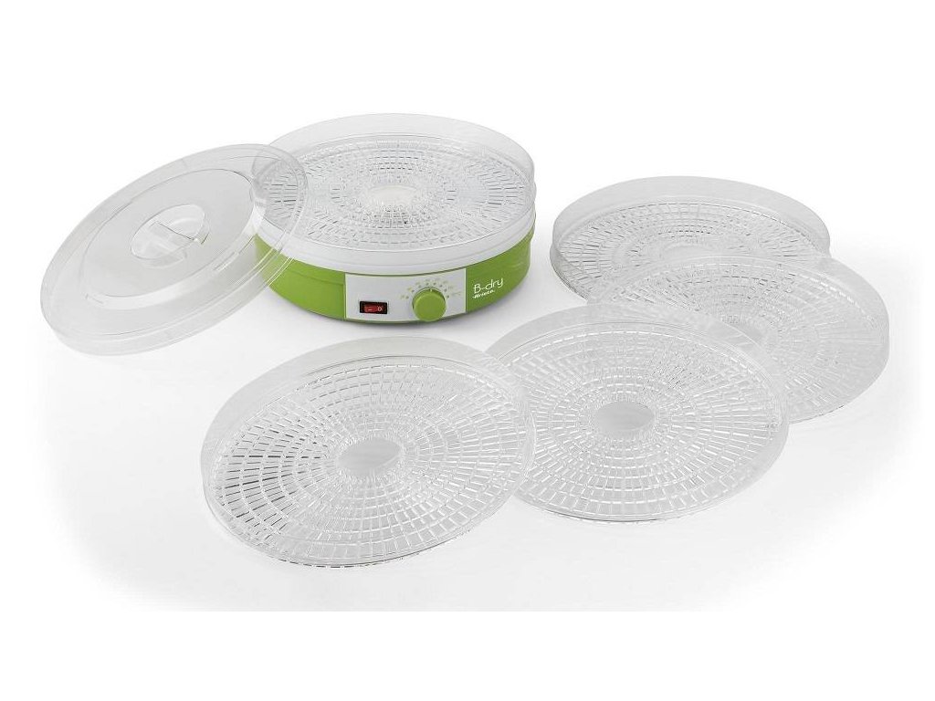 Výkon 245 W •Nastavitelná teplota od 35 ° C do 70 ° C •Rovnoměrné rozložení tepla •Vhodné pro sušení různých druhů potravin jako ovoce, zelenina, houby, bylinky, maso •Proces sušení zachovává minerály a vitamíny v potravinách •5 průhledných výměnných vrstev o průměru víka 32 cm •Tlačítko vypnutí / zapnutí