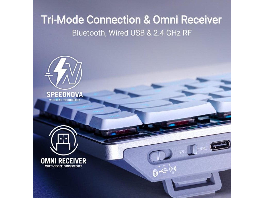 Připojení ve třech režimech: Připojte se přes Bluetooth® (až tři zařízení současně), 2,4 GHz s bezdrátovou technologií ROG SpeedNova nebo kabelové USB