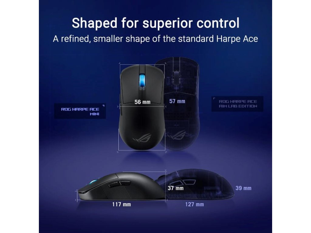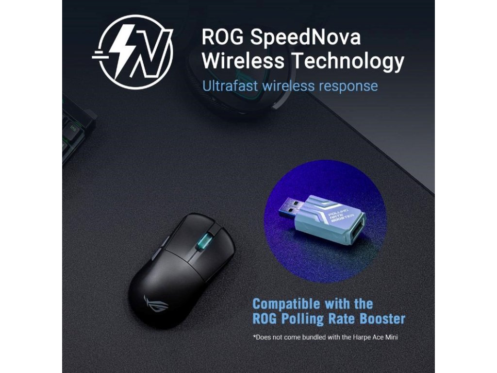 ROG Harpe Ace Mini je ultralehká 49gramová polosymetrická herní myš s tvarem schváleným profesionálními hráči FPS. ROG Harpe Ace Mini je vybaven optickým senzorem ROG AimPoint Pro s rozlišením 42 000 dpi a optickými mikropřepínači ROG a zobrazuje špičkový bezdrátový výkon s bezdrátovou technologií SpeedNova a podporuje až 8 000 Hz bezdrátovou rychlost dotazování (kompatibilní s ROG Polling Rate Booster).